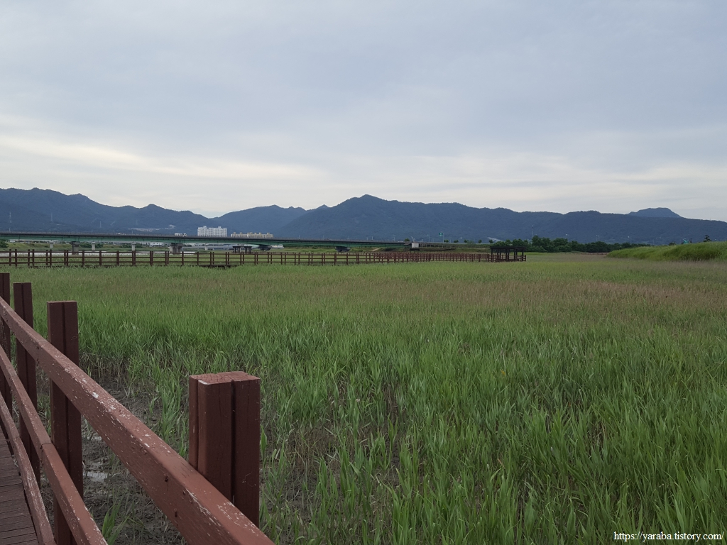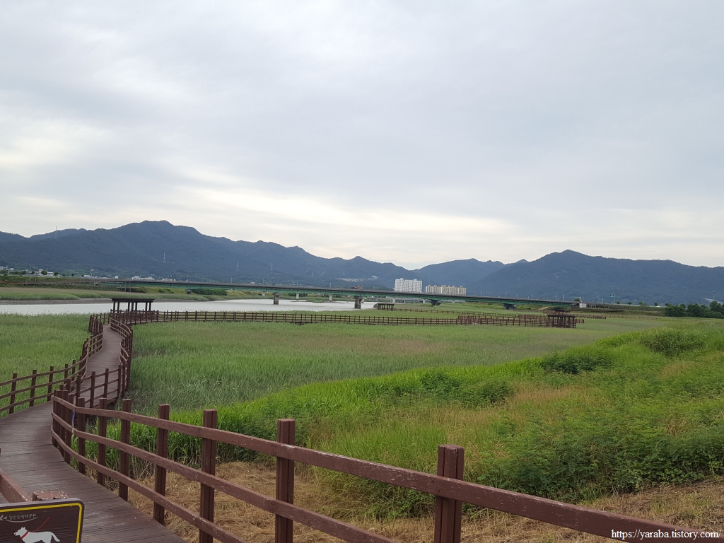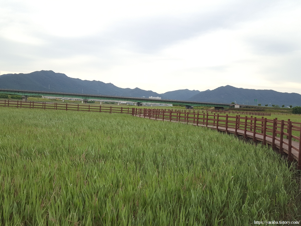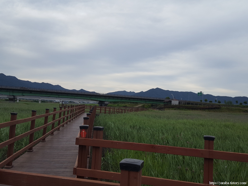 갈대밭 사이의 데크길은 목리 1교 다리 아래를 통과하여 둑방길로 올라간다.