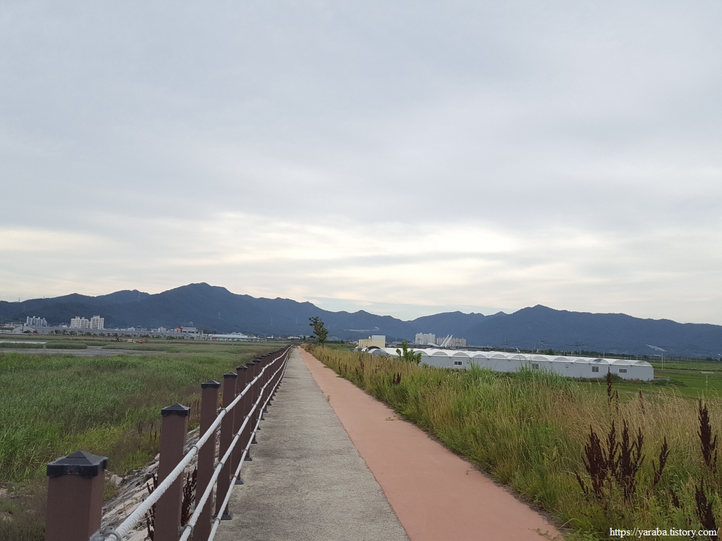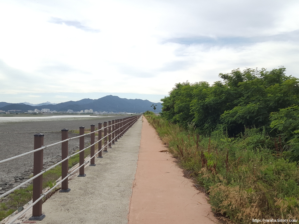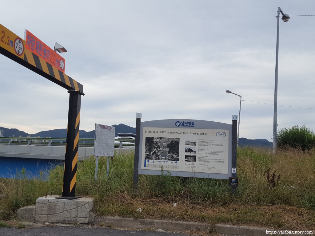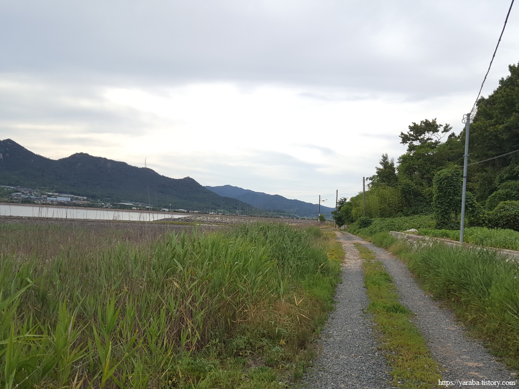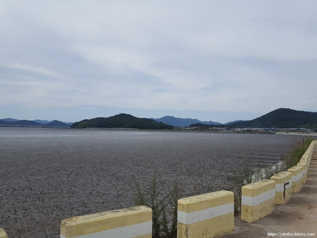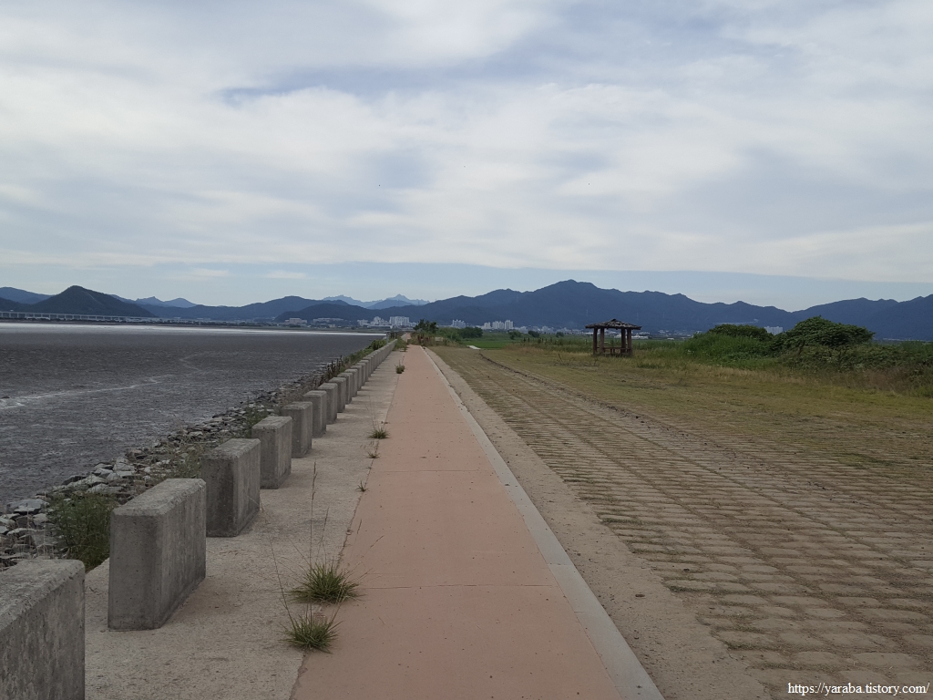 길은 강진만 동쪽 방조제 배수갑문을 지나 3Km에 이르는 방조제 둑방길을 걷는다.