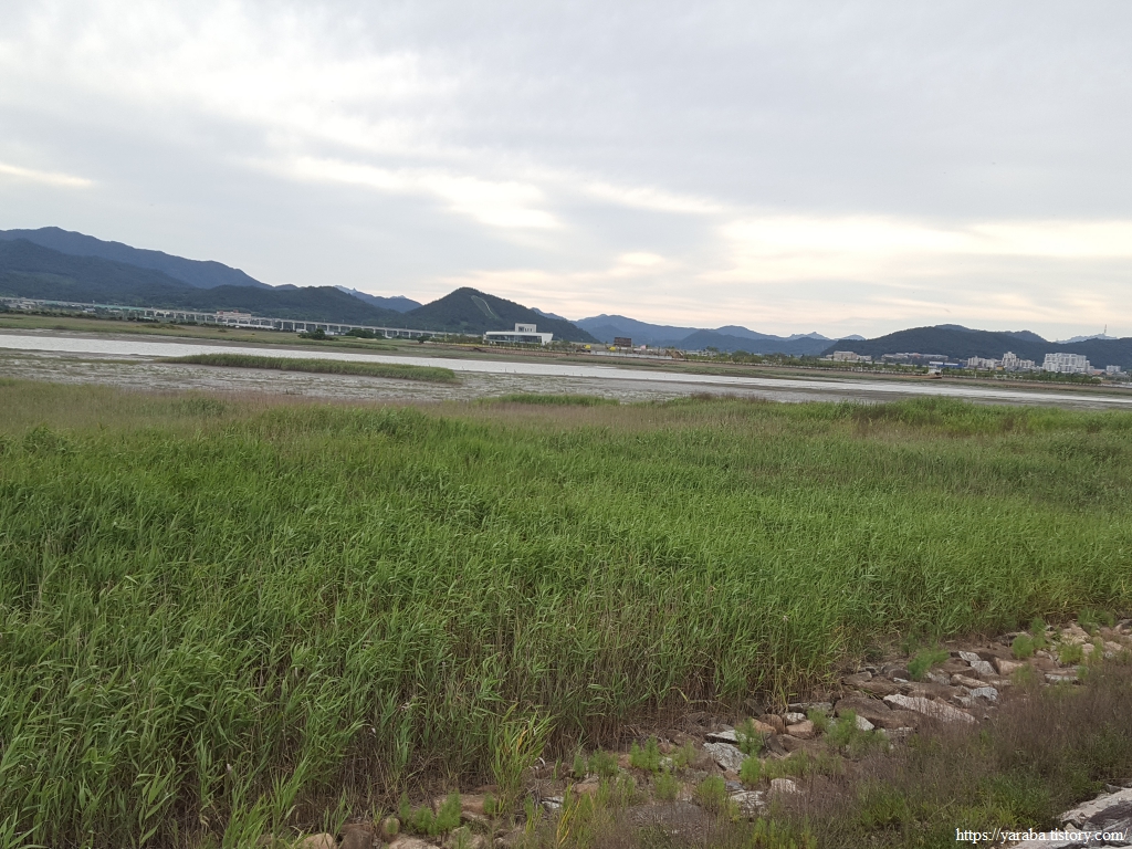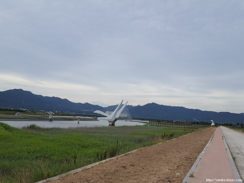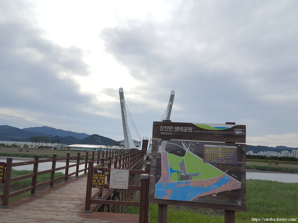 탐진강 너머 강진만 갈대밭과 강진만 생태공원으로 갈 수 있는 백조다리라는 이름의 인도교 앞을 지난다.