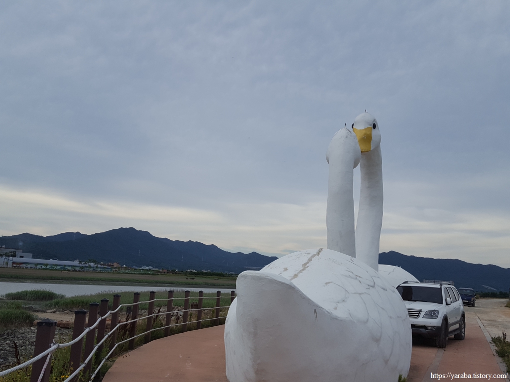 둑방길에는 천연기념물 큰고니의 대형 조형물이 세워져 있었다. 매년 겨울 강진만생태공원에서 월동한다.