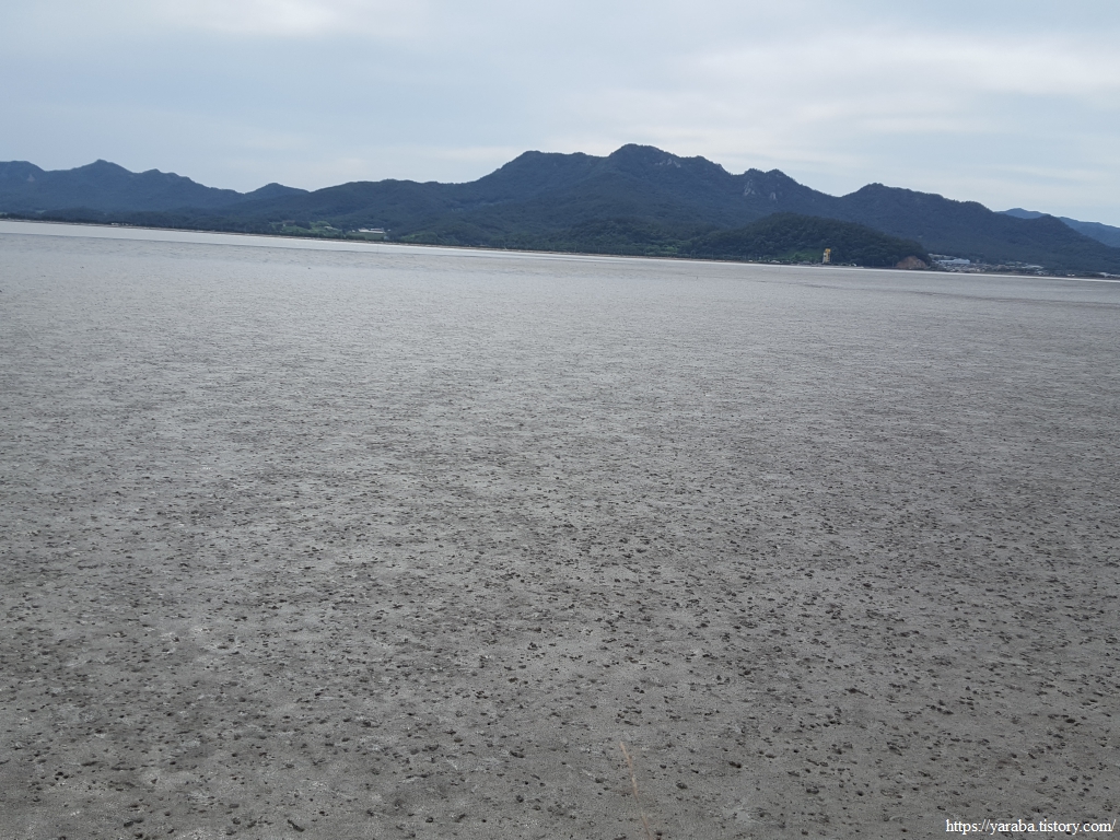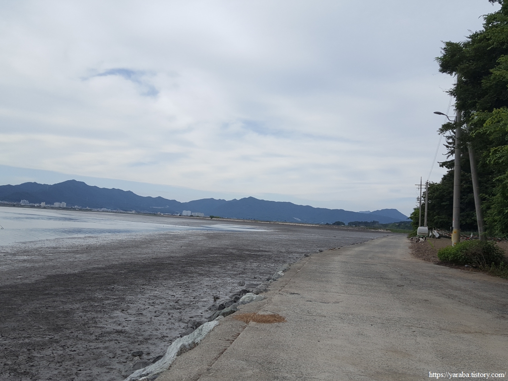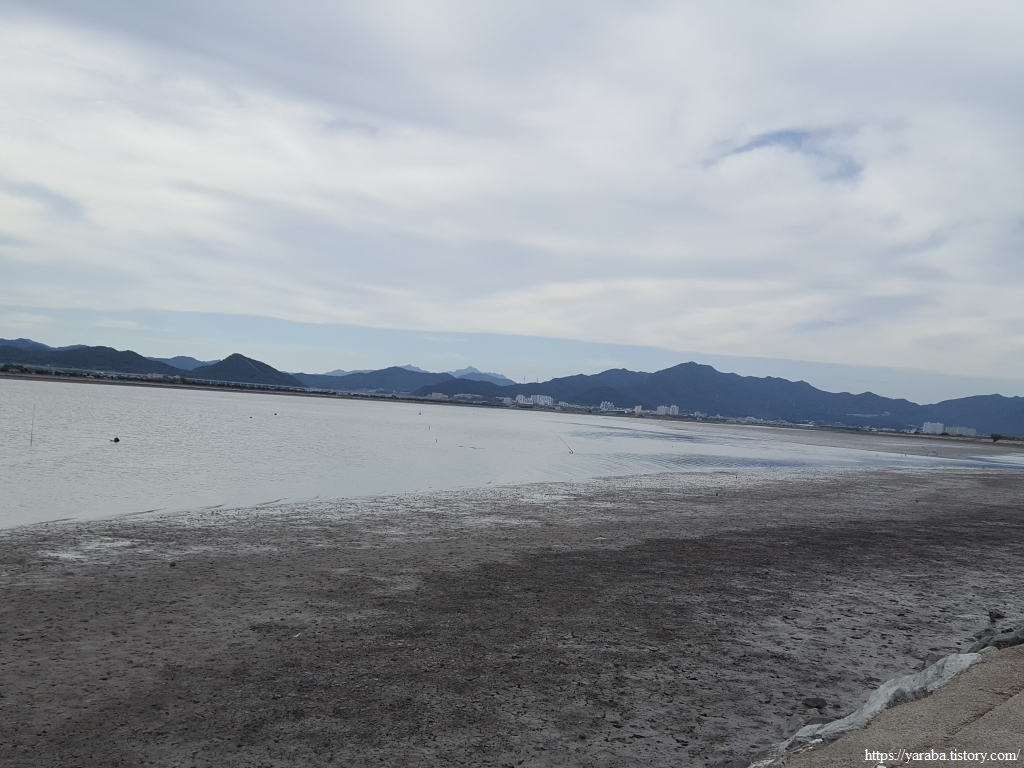 만복 마을에서 해변으로 나오면 강진만 바다 건너로는 만덕산(412m)과 함께 산 아래로 길게 자리한 만덕 방조제가 보인다. 물 빠진 갯벌은 건너편 해변까지 닿을 것 같다. 이제는 바다가 아니라 탐진강 하구라고 해야 맞는 것 아닌가 하는 생각도 든다. 북쪽으로는 칠량농공단지와 좌측으로 생금봉이 보이는데 저 생금봉을 지나면 강진 시내가 시야에 들어올 것이다.