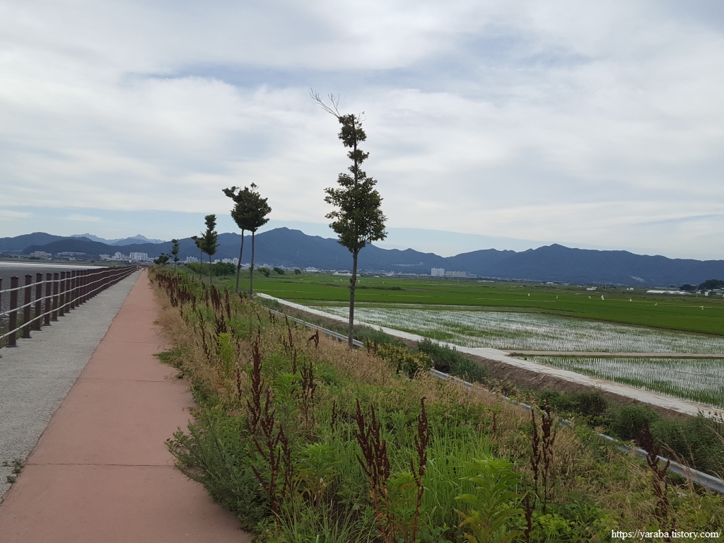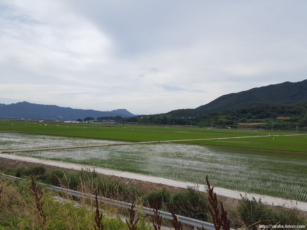탐진강이 오랜 세월 내륙에서 실어온 흙들은 강진만 방조제 옆으로 광대한 평야를 만들었다. 이곳은 논들은 모내기가 끝나서 한창 성장기에 있다.