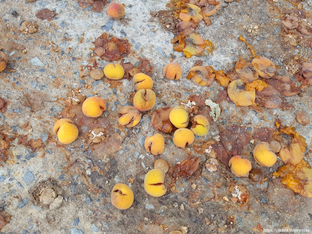 포구 바닥에 뭐가 잔뜩 떨어져 있었는데 살구였다. 커다란 살구나무가 맺은 살구는 거두는 사람 없이 콘크리트 바닥이 모두 먹는다.