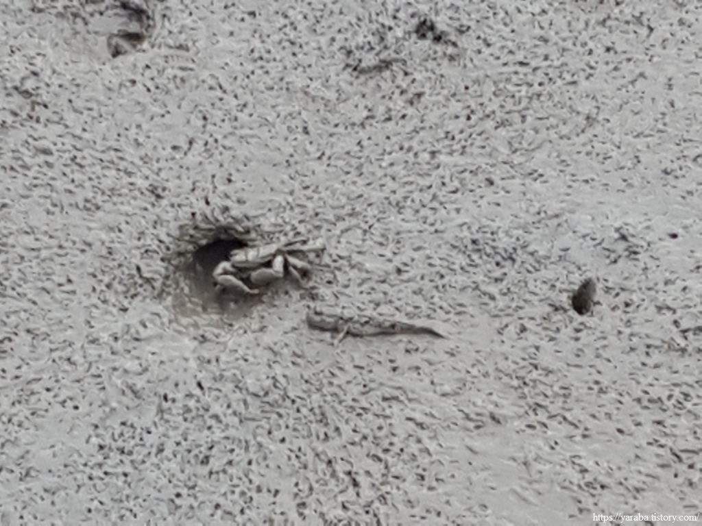 탐진강과 강진천이 내려오는 길목의 갯벌도 게와 짱뚱어 세상이다. 게 집 앞에 서성이는 짱뚱어의 모습에 둘 사이가 어떻게 될지 궁금하다. 짱뚱어가 게를 잡아먹지는 않지만 게는 작은 물고기도 잡아먹으니 집게발로 짱뚱어를 잡을 수만 있다면 그 이후는 모를 일이다.