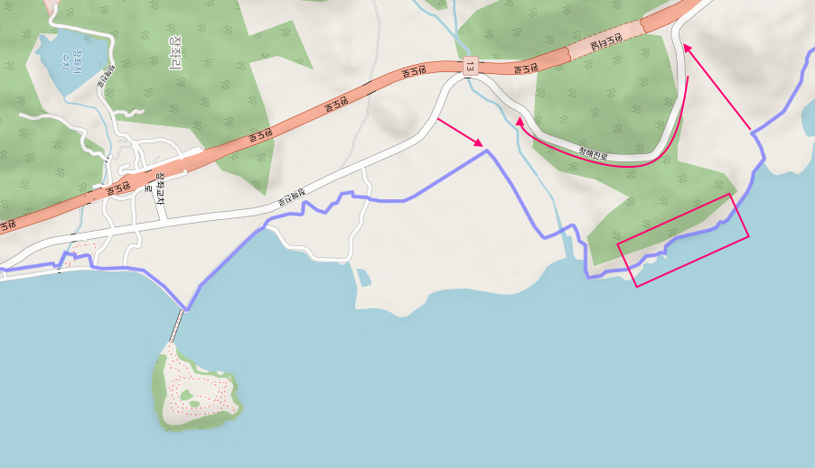 "대창 2구 마을회관~대야 2구 마을회관(1.9km) 만조시 원일수산~대야랜드 우회노선을 이용 바랍니다."라는 공지가 있었는데 지도에서 사각형으로 표시한 구간으로 길 대신 그냥 해안을 걷는 구간이다. 상황이 괜찮으면 그냥 지난다. 완도 청해진 유적이 있는 장도 앞의 장좌리에서 장보고 기념관(18.4Km)을 지난다.