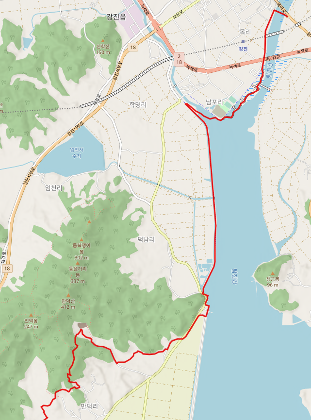 83코스는 "강진만생태공원 갈대숲 데크길 통제에 따라 탐진강 제방길(자전거길)로 우회 이용 바랍니다."라는 공지가 있었다. 어제 여정을 끝냈던 목리교로 다시 나와 둑방길을 통해 길을 이어간다. 둑방길을 지나면 해창 마을 이후 만덕산 방향으로 이동하여 백련사와 다산초당(10.4Km)을 지난다. 이 구간은 고도 150미터 정도의 산길을 걸어야 한다.