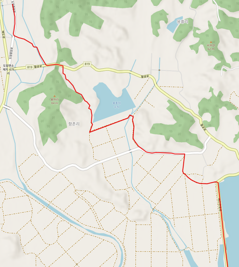 도암면 읍내를 출발한 농로를 통해서 해안으로 나간다. 도암천을 따라 내려가다가 용흥저수지(2.3Km)를 지나 해안 관광로를 통해서 도암배수갑문(5.8Km)에 닿는다.