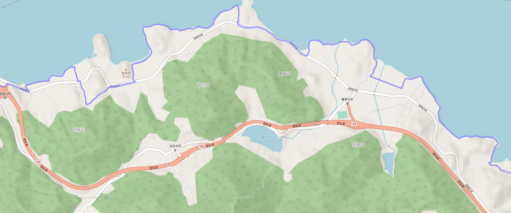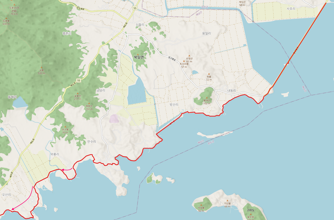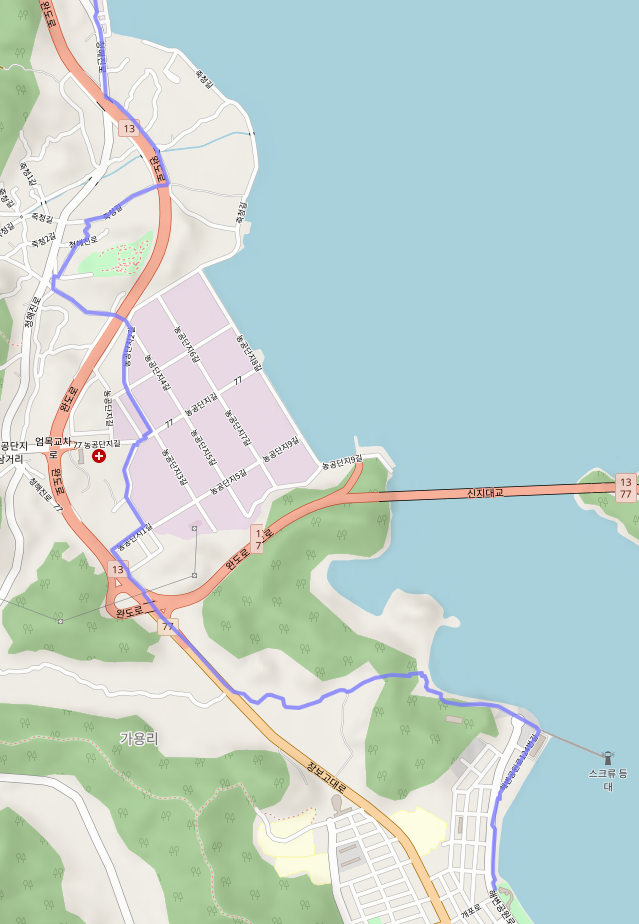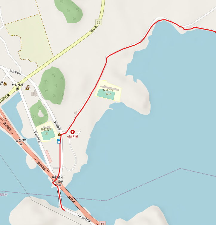 길은 북평 초등학교를 지나 완도 초입인 남창정류소(달도)에서 여정을 마무리한다. 여정을 마무리하면 숙소가 있는 군외면 원동리까지 4Km 정도를 더 이동한다.