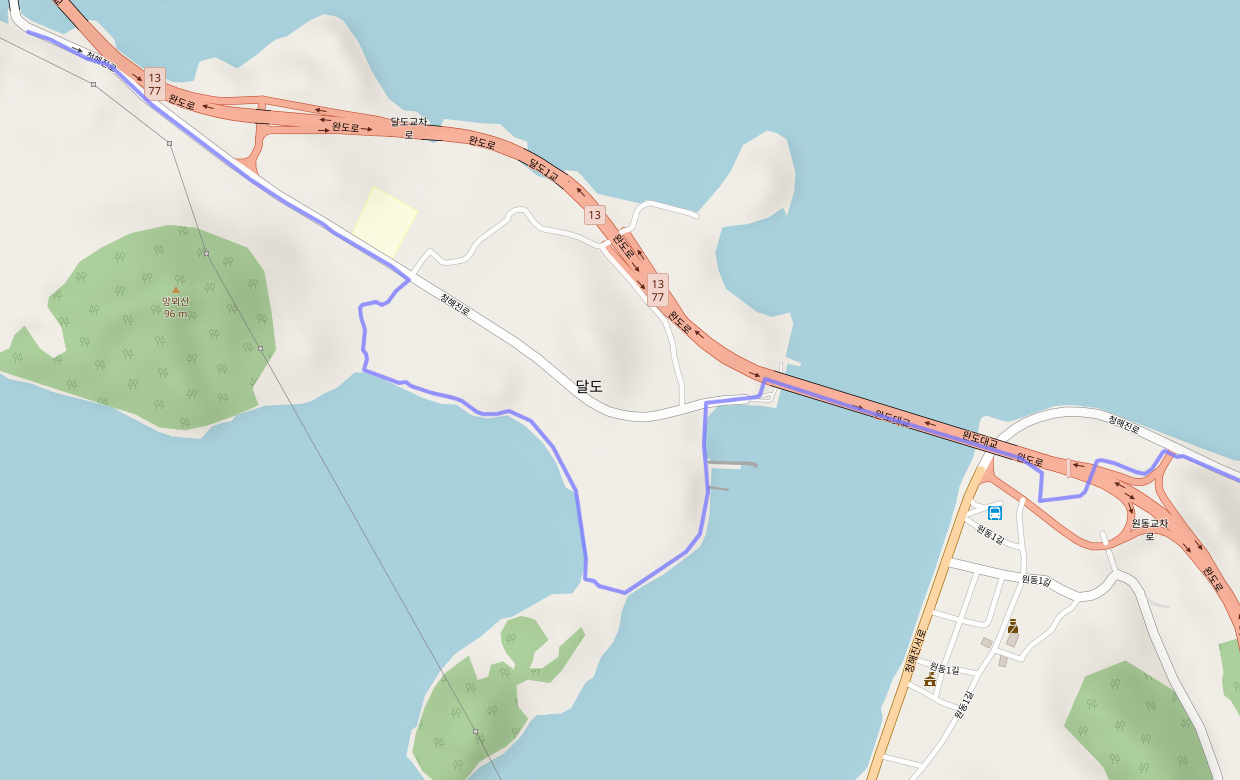 달도를 출발하면 완도대교(3.1Km)를 거쳐 군외면 읍내인 원동리에서 하룻밤 쉬어간다. 오늘의 숙소 후보는 동원모텔이다. 숙소 인근에 편의점과 마트도 있다. 저녁식사 후보는 해영식당 백반이다.