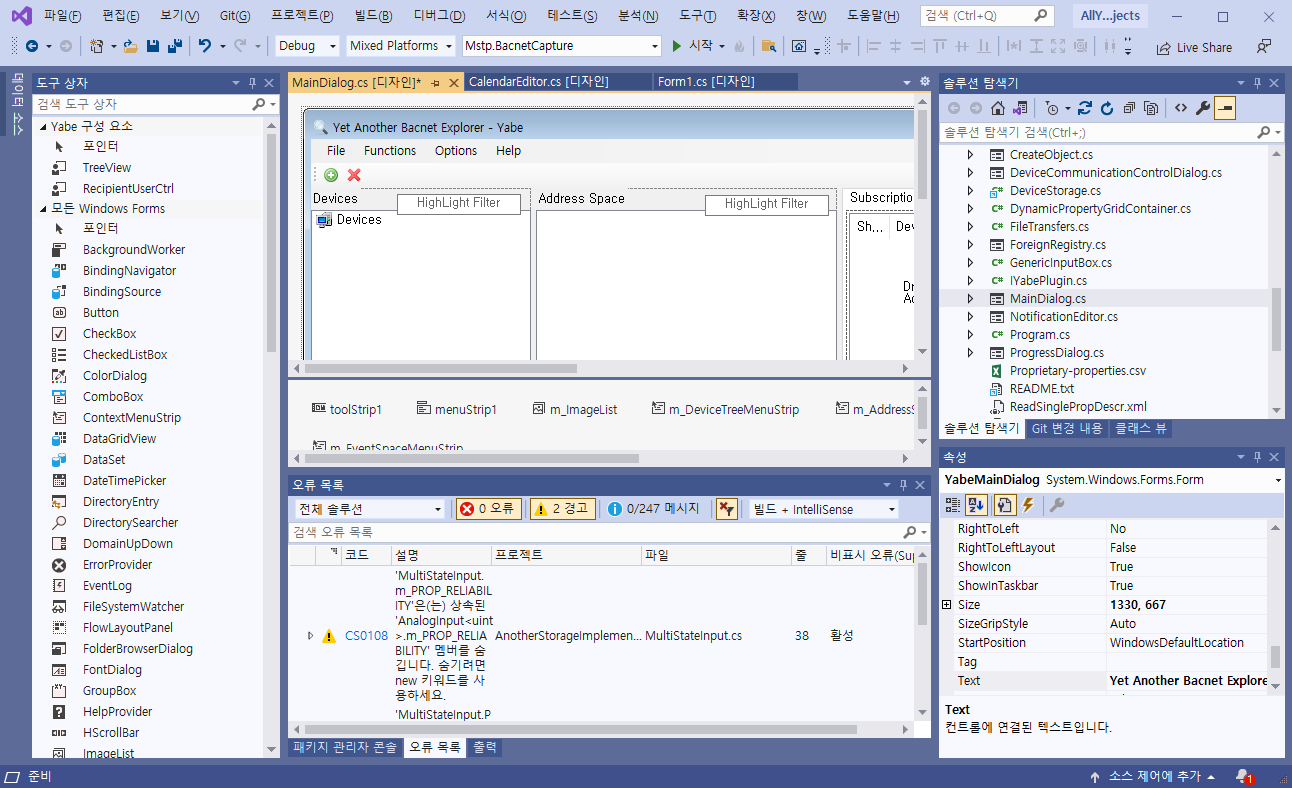 솔루션을 전체 빌드하니 오류는 없고 경고 2개가 전부이다. 코드도 깔끔한 모습이다. 프로그램 번역을 감안하고 살펴보니 응용 자체가 다국어 기반으로 만들어지지는 않았고 WinForm 내부에 일일이 텍스트를 변경해 주어야 하는 상황이다. 고치다 보면 새로운 프로그램이 되겠다 싶다.