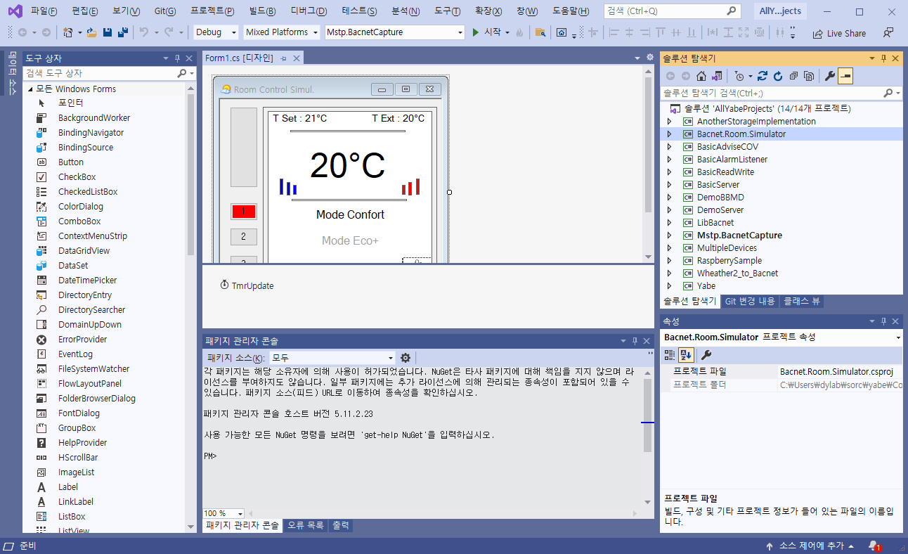 솔루션이 정상적으로 열린 상태에서 시뮬레이터 폼을 열어본 화면이다.