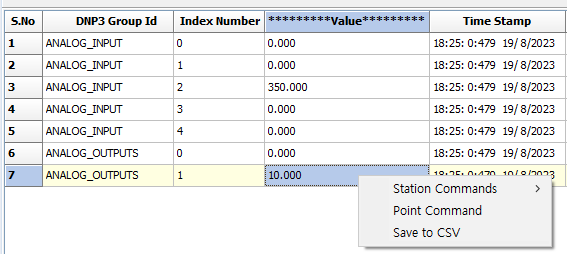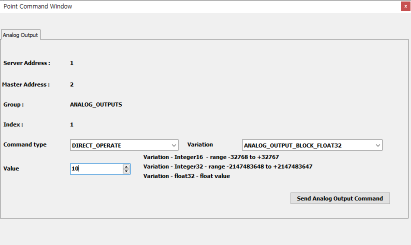오브젝트가 읽기 전용이 아니라 출력도 가능한 ANALOG_OUTPUTS와 같은 포인트면 위의 그림처럼 값 항목에서 우측 마우스로 클릭하여 콘텍스트 메뉴> Point Command로 아웃스테이션의 포인트 값을 클라이언트에서 수정할 수 있다.