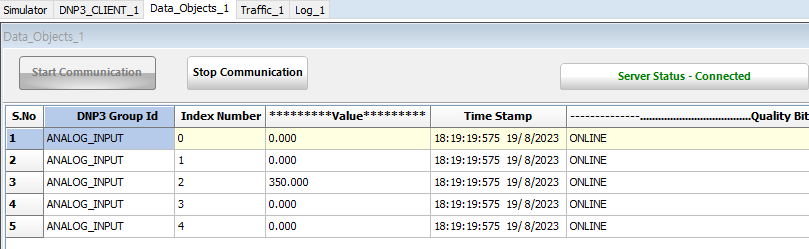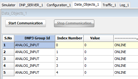 아웃스테이션의 정보를 입력했으면 [Data Object] 탭을 클릭한다. 서버와 달리 [Configuration]이 없다. [Data Object] 탭에서 [Start Communication] 버튼을 누르면 서버와 연결하여 위의 그림과 같이 데이터를 가져온다.