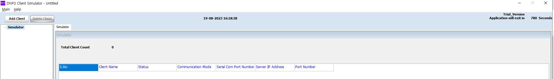 DNP3 마스터(클라이언트) 시뮬레이터를 설치하고 실행하면 서버처럼 우측 상단에서 15분 제한 시간 중에서 남은 시간을 확인할 수 있다. 각종 설정은 서버처럼 File> Save 및 Open 메뉴를 활용해서 저장하고 복원하여 사용하면 15분 제한 시간을 극복하면서(?) 시뮬레이터를 사용할 수 있다.