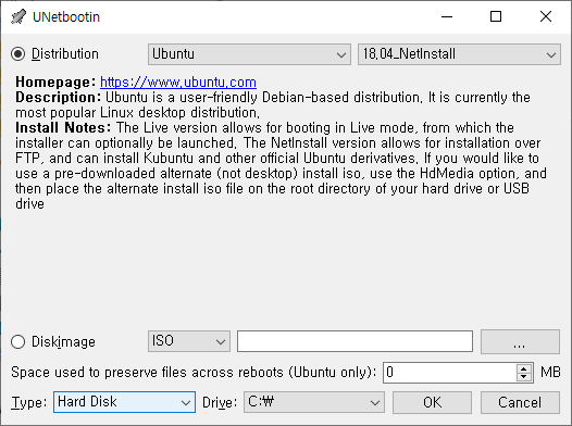 다음 작업이 중요한데 맨 하단의 Type을 USB로 선택하면 USB 부팅을 위한 이미지를 만드는 것이지만 지금은 USB 부팅이 불가능하지만 인터넷이 가능한 시스템을 리눅스로 바꾸는 것이므로 Type을 "Hard Disk"로 선택하고 시스템을 설치할 드라이브를 지정하고 [OK]를 누르면 작업이 시작된다.