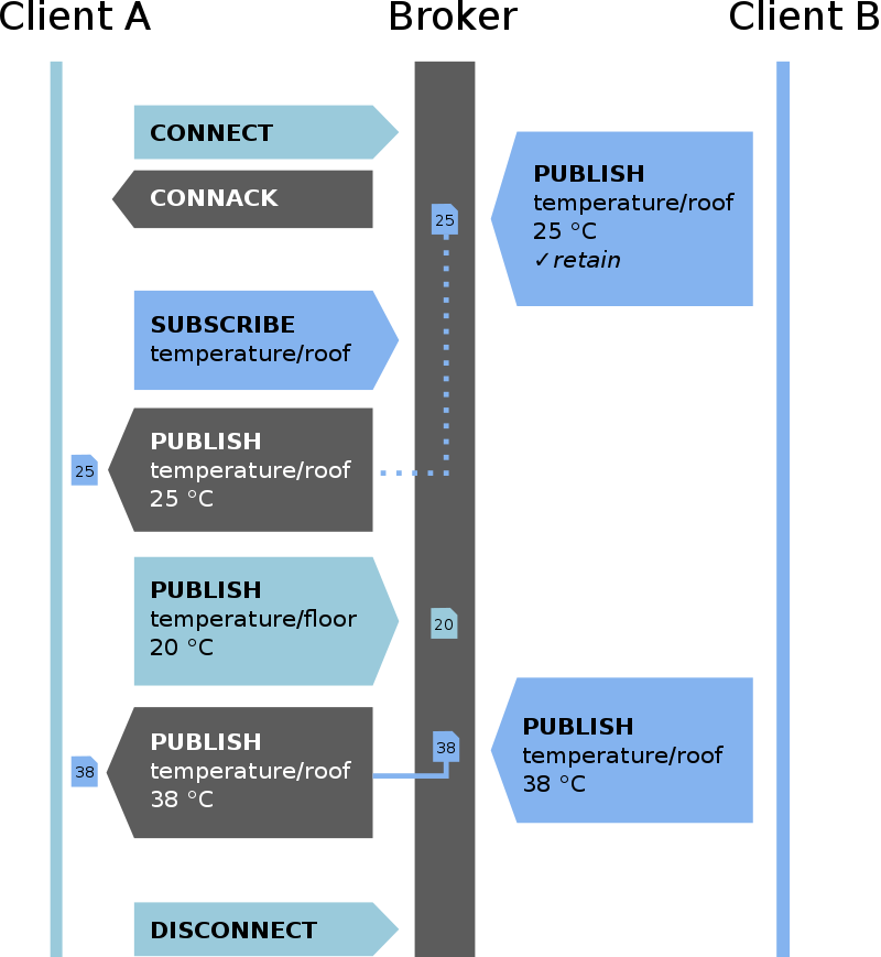 위의 그림에서 보듯이 각 클라이언트는 짧은 정보를 브로커(Broker)에 던지고 특정 정보를 구독하는 클라이언트에게 해당 정보과 전달되는 방식이다. 클라이언트 B를 온도 센서라 한다면 클라이언트 A는 모바일기기 일수도 있고 정보를 수집하는 서버일 수도 있다. 동일한 토픽(topic, 그림에서는 temperature/roof)을 구독하는 클라이언트가 여러 개 일수도 있다.