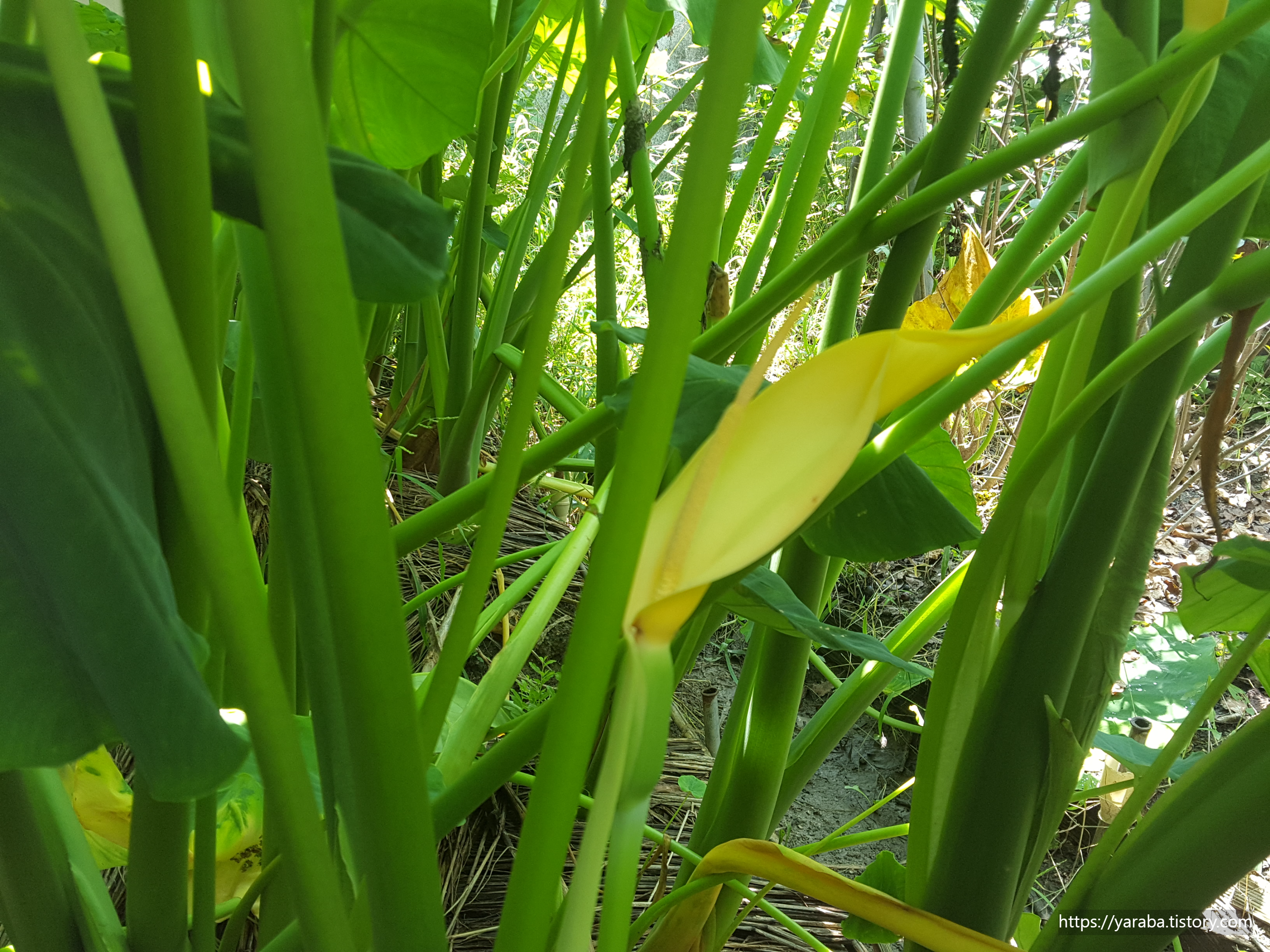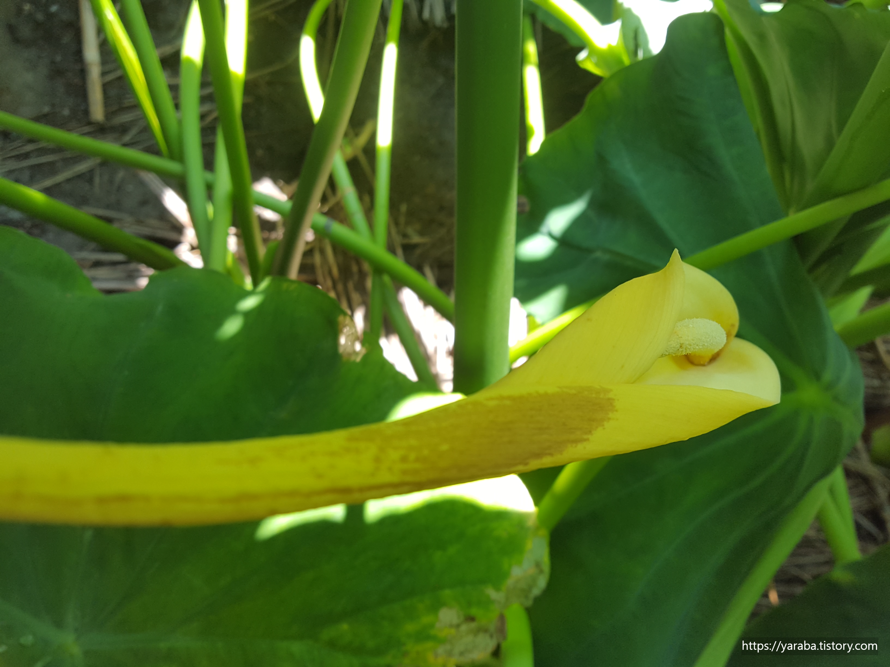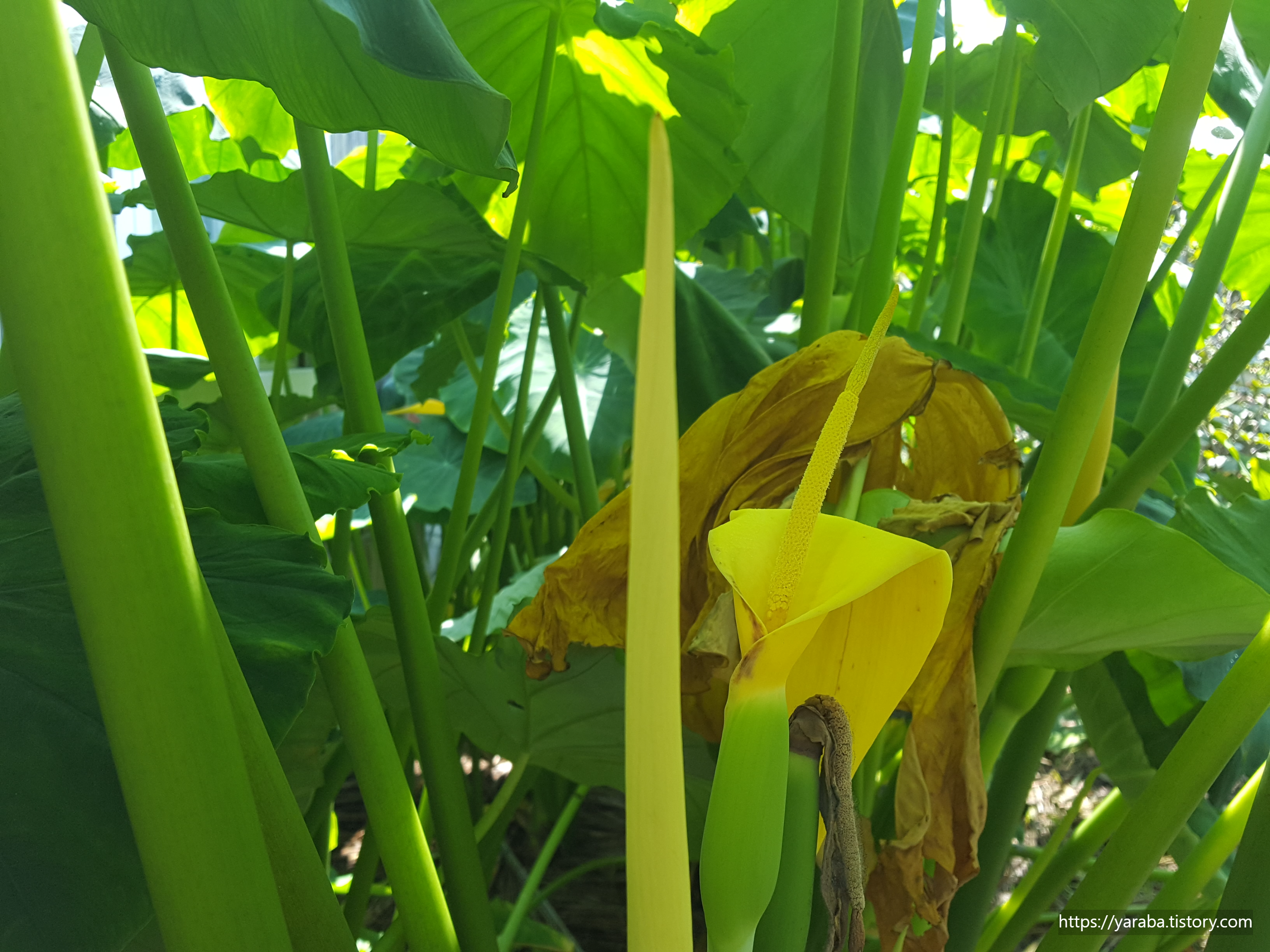 향수 냄새가 아니라면 이렇게 마음을 흔들고 있는 향기는 어디서 오는 것일까? 근처에서 하얀 꽃을 피우고 있는 부추꽃 냄새는 아니었다. 알싸한 매운맛을 가진 부추의 꽃 향기도 엄청나게 향기롭지만 부추꽃 향기를 맡으면서 풀을 뽑았으니 머리에 새겨진 부추꽃 향기는 충분히 구별할 수 있었다. 열매를 맺고 있는 나무들에서 나는 냄새도 아니고, 이리저리 둘러보던 그때 숲처럼 우거진 토란 밭을 보니 토란대 사이로 노란 토란꽃들이 그 존재감을 뽐내고 있었다.