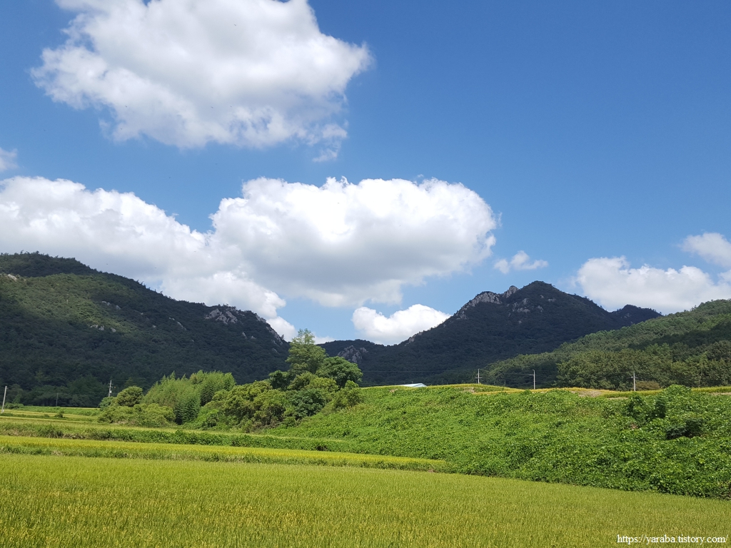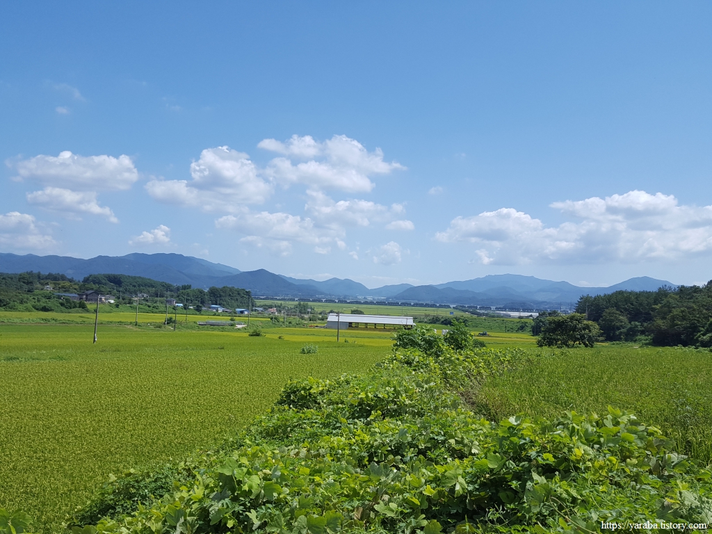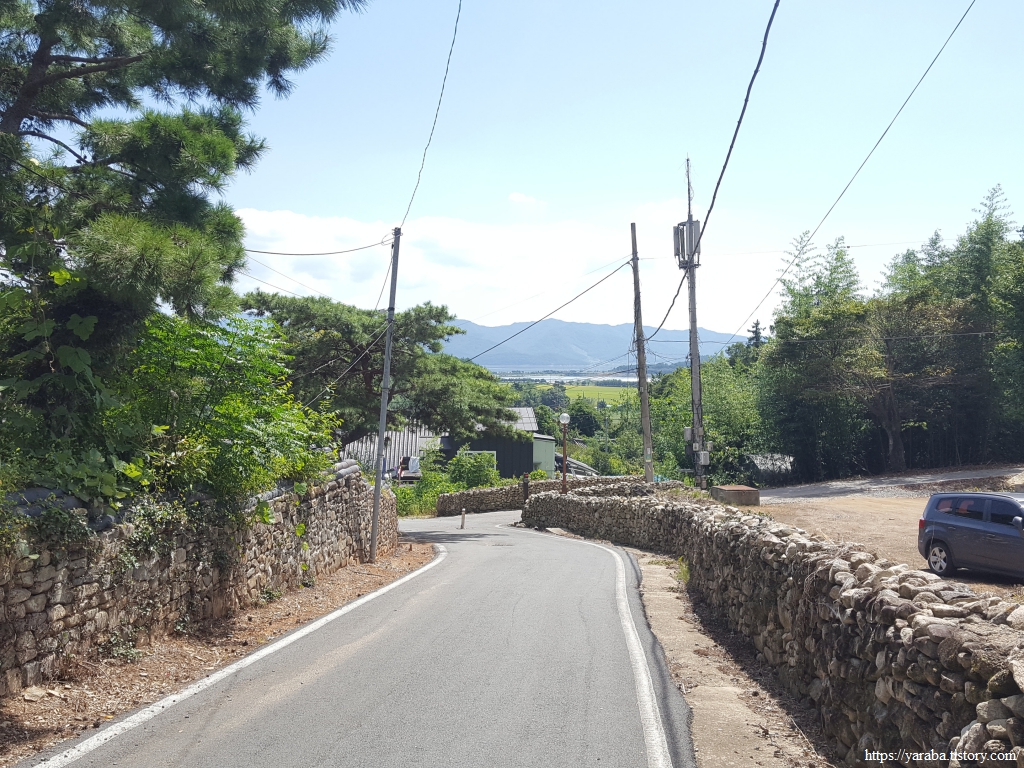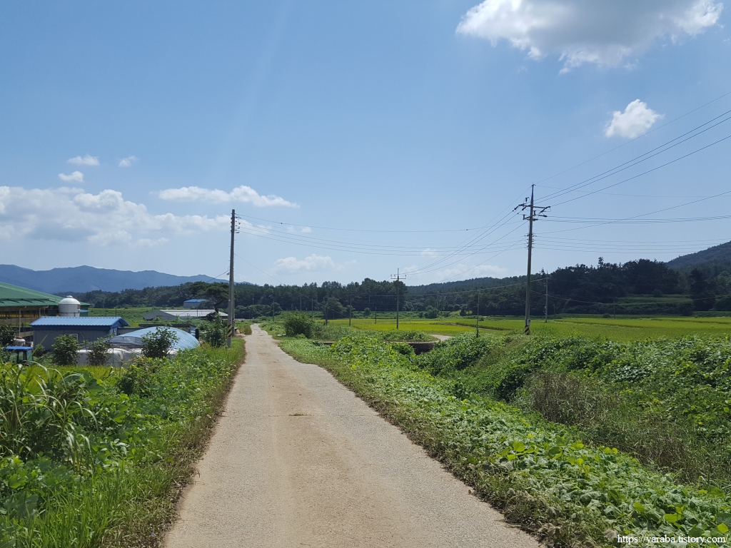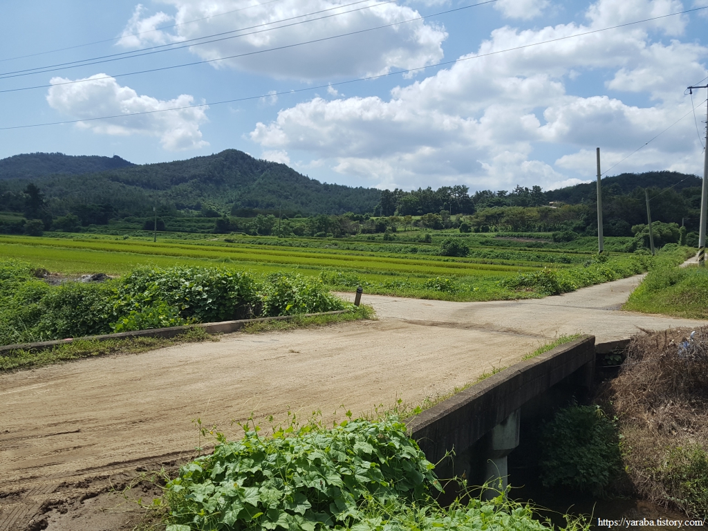 길은 만덕리 들판을 가로질러 바다로 나가는 개천을 건너서 개천 건너편에서 길을 이어간다. 하늘에 둥둥 떠다니는 조각구름들이 내 머리 위에서 나를 따라다니면 얼마나 좋을까? 하는 부질없는 희망을 품으며 뙤약볕 아래를 걷는다.