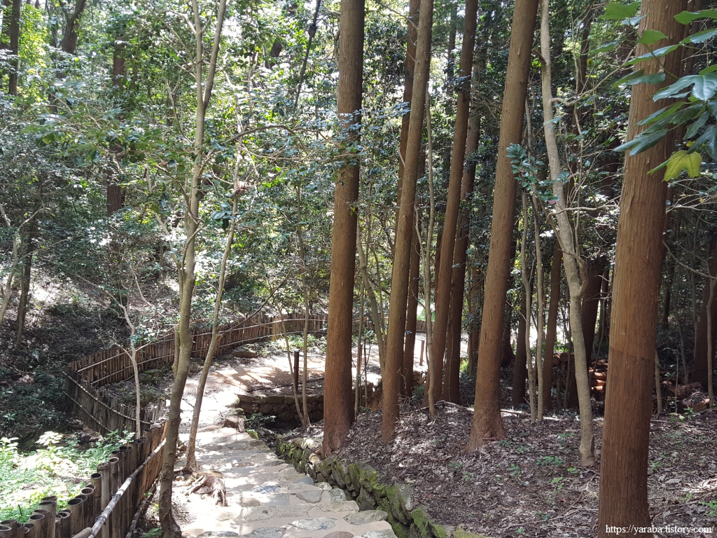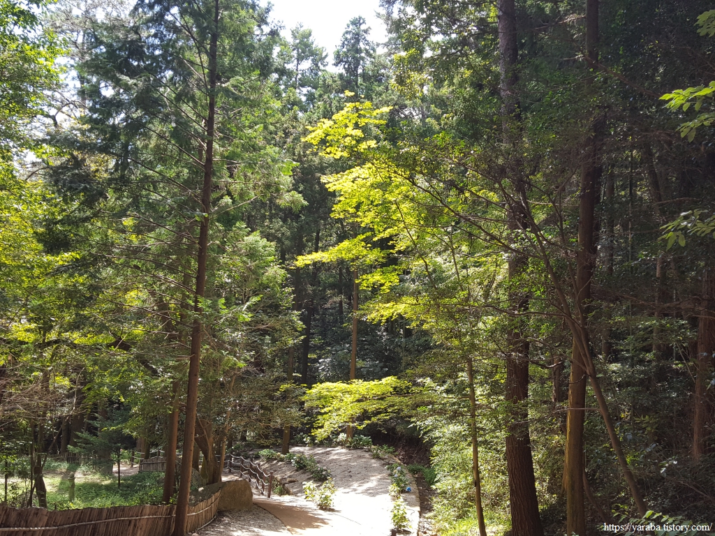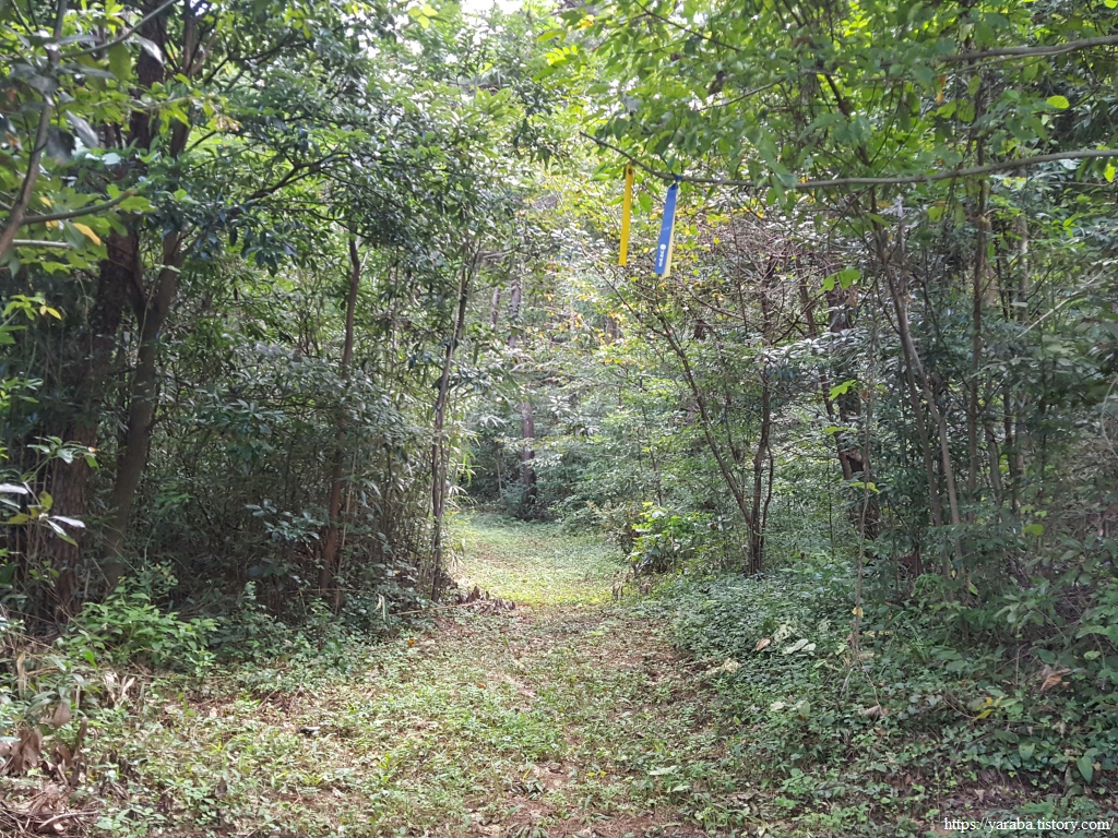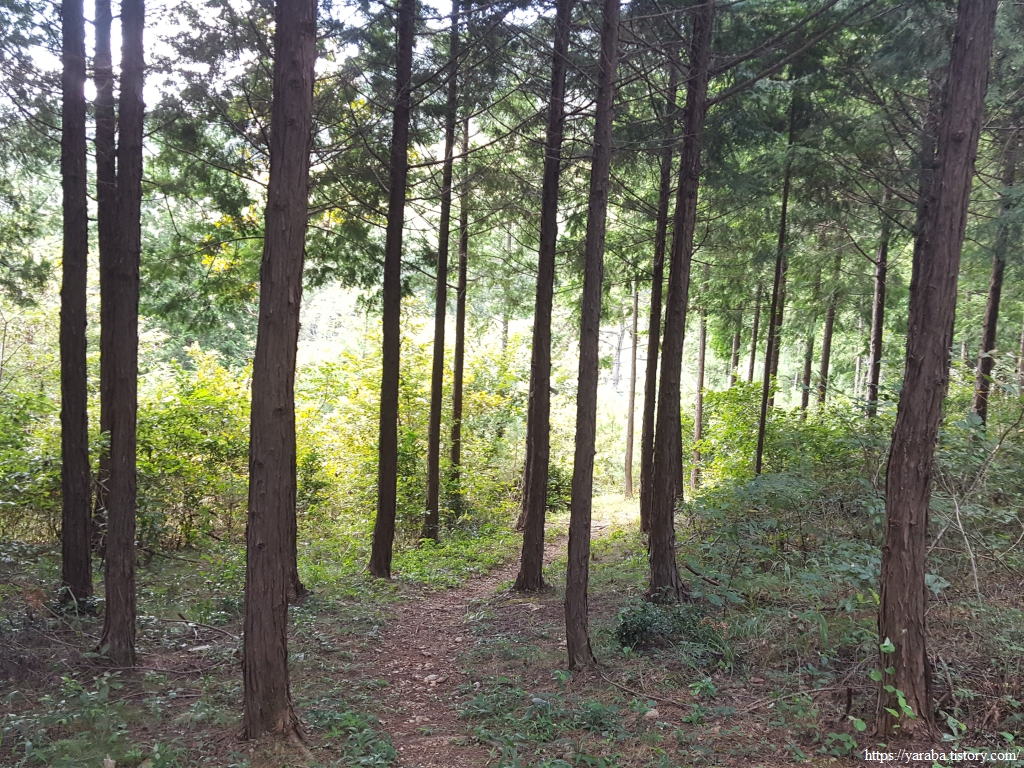 하산길은 하늘로 쭉쭉 뻗은 편백숲 사이를 걷는다. 햇살이 겨우 들어올 정도의 울창한 숲이므로 아이들과 이곳을 방문하는 분들은 모기 기피제를 뿌리고 올라가는 것이 좋다.