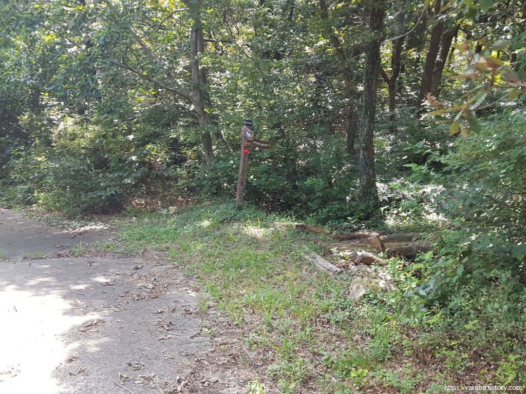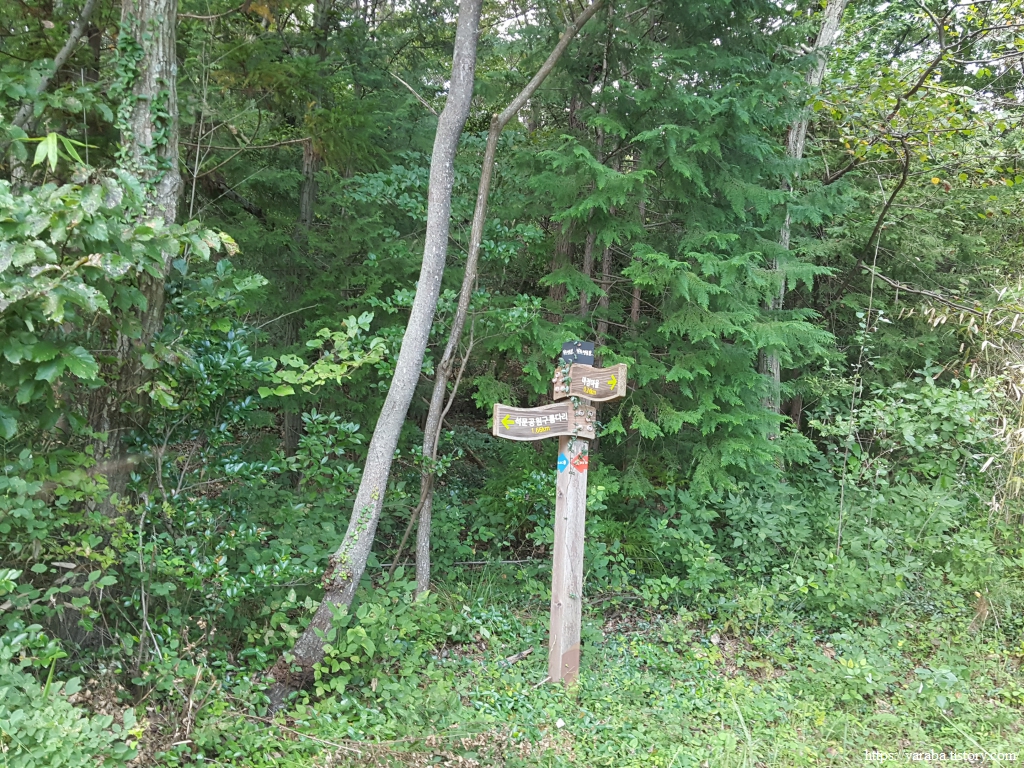 길은 어느덧 용문사로 올라가는 갈림길에 도착했다. 길은 도로를 가로질러 직진하여 내려간다. 이제 석문공원이다.