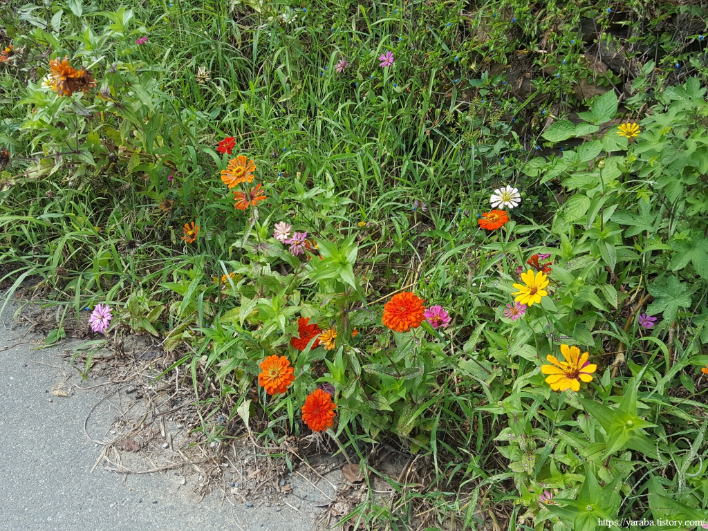 아무도 돌보지 않아도 씨앗으로 번식하는 백일홍이니 내년에도 내후년에도 이곳에서 존재를 뽐낼 것이다. 배롱나무의 꽃도 백일홍이라 부르는데 화려한 모습은 비슷하지만 분위기는 완전 딴판이다. 백일홍 꽃을 보고 있으면 색깔에서 멕시코 전통 의상의 느낌이 나는 것은 단지 나만의 느낌일까?