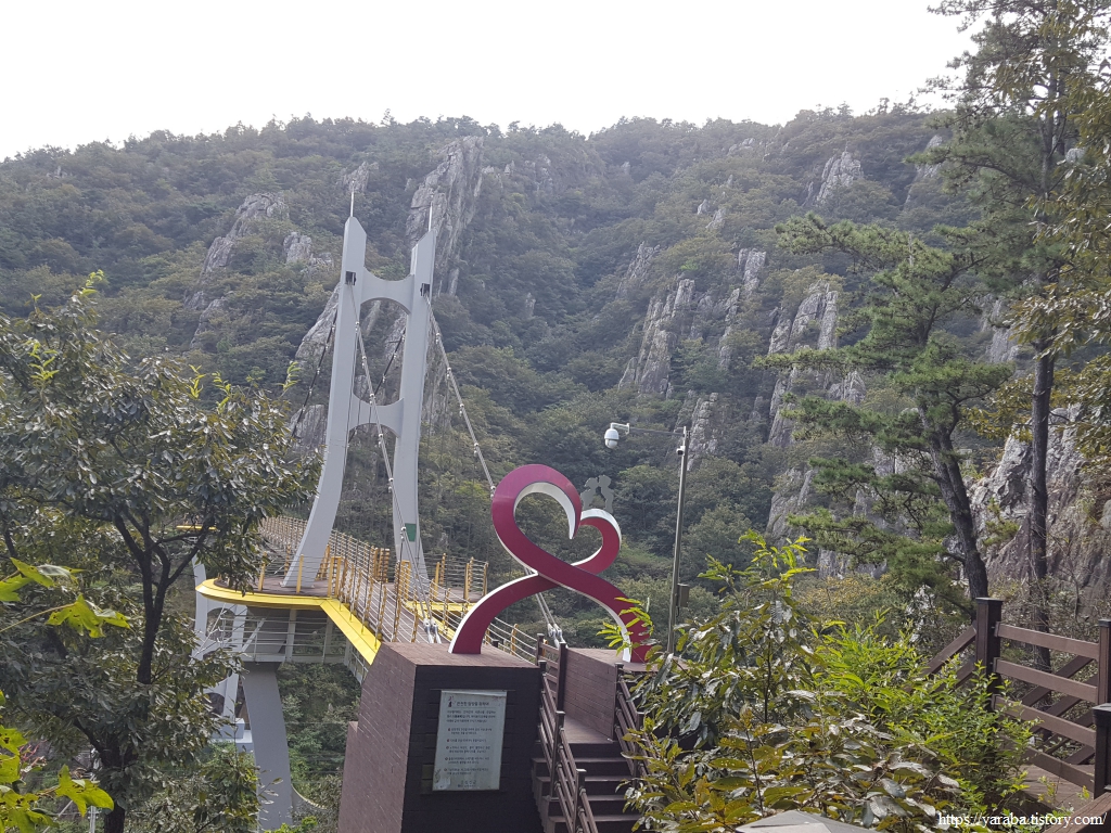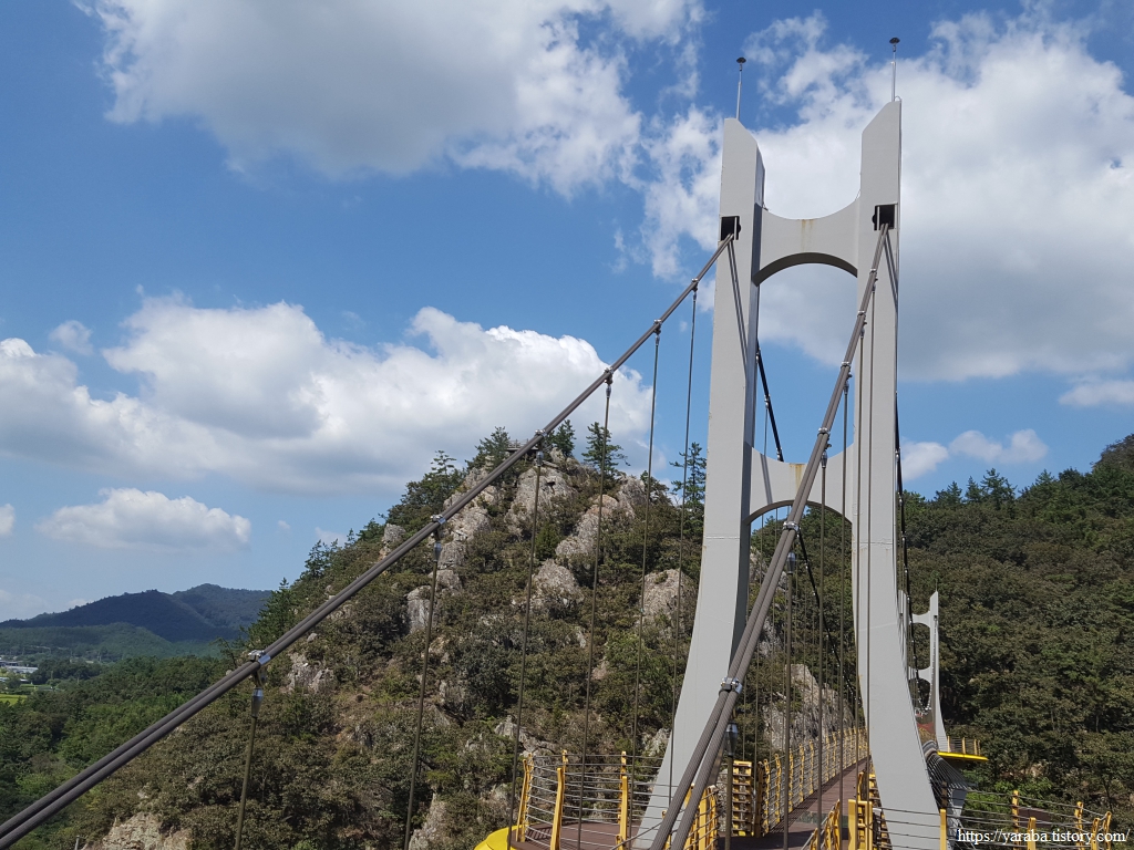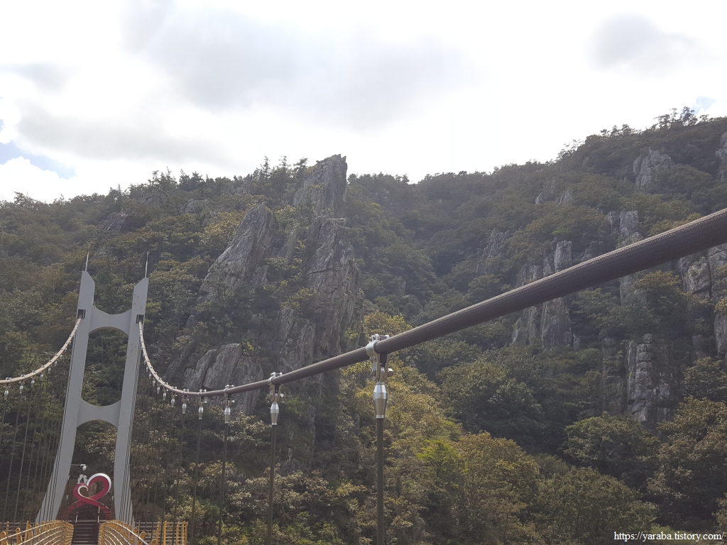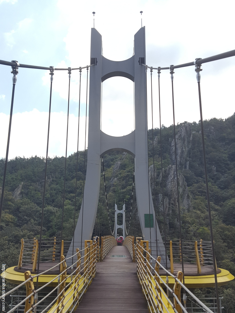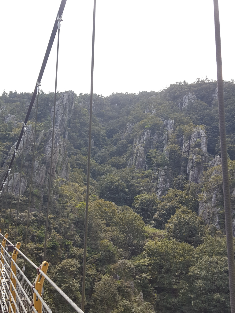 웬만한 구름다리를 다녀 보았지만 다리 중간쯤 지나니 바람이 세지 않은데도 다리가 후들거릴 정도이다. 석문산에 단풍이 들면 풍악산이라 부르는 가을 금강산에 견줄 만도 하겠다 싶다.
