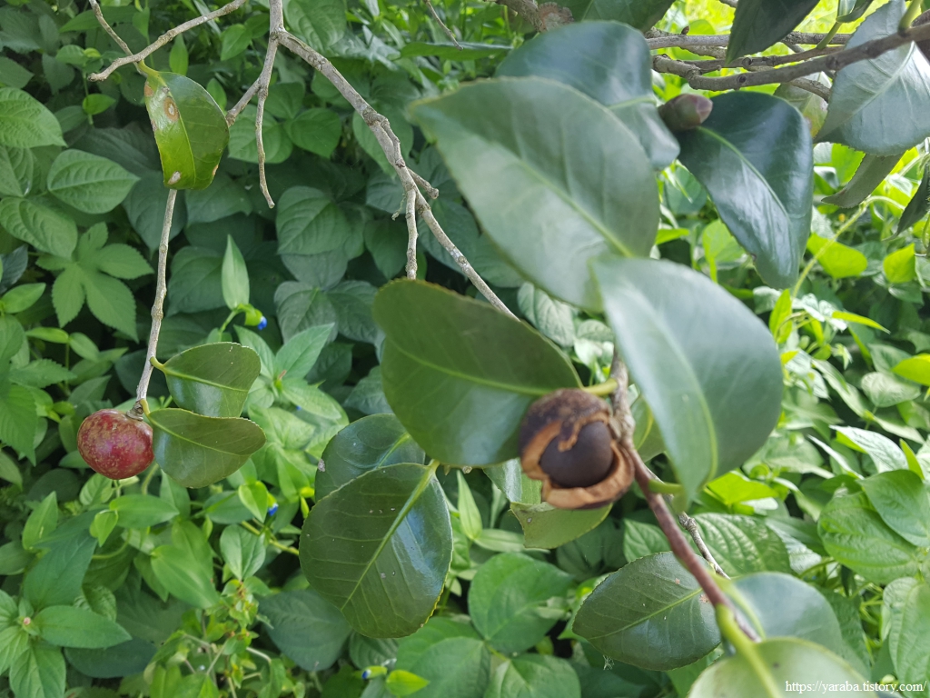 주렁주렁 달린 열매가 동백 열매라는 것은 상상도 하지 못했다. 이번 여행에서 처음 만난 동백 열매가 아니었다면 동백의 일부만 아는 것이었을 것이다. 밤송이처럼 벌어진 열매 속의 잣처럼 생긴 열매가 모아서 기름을 짜서 맛보면 동백을 조금 더 깊이 알게 될 것 같다.