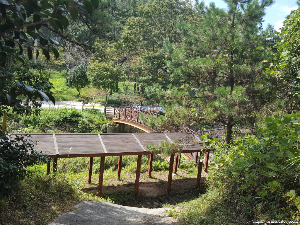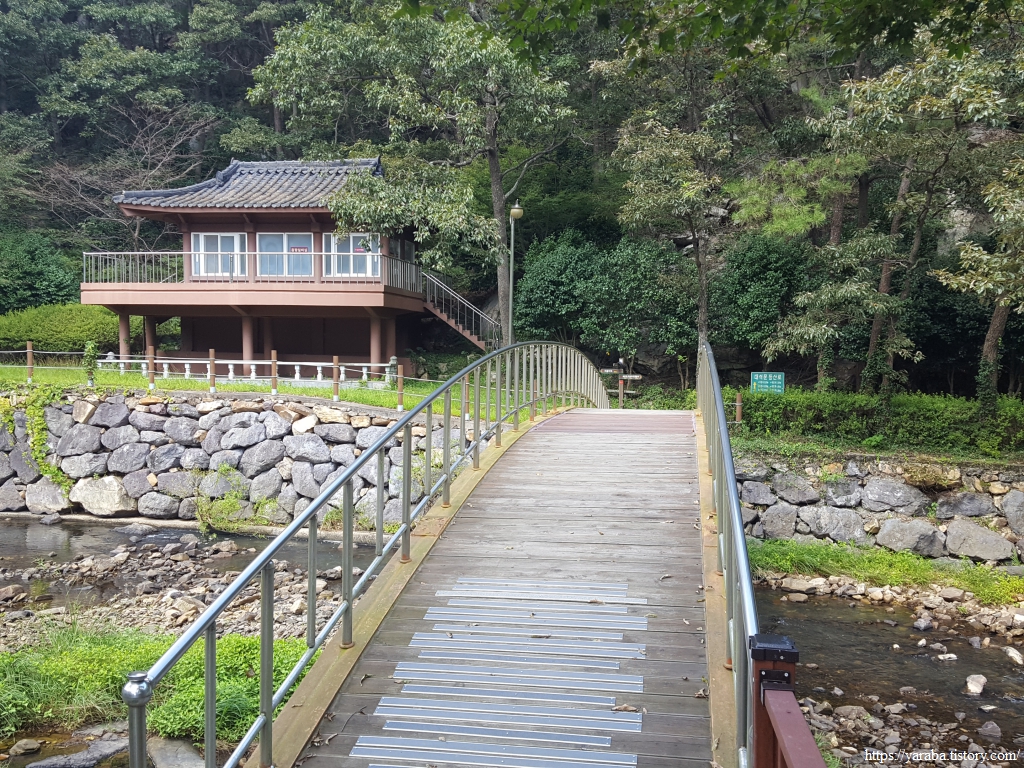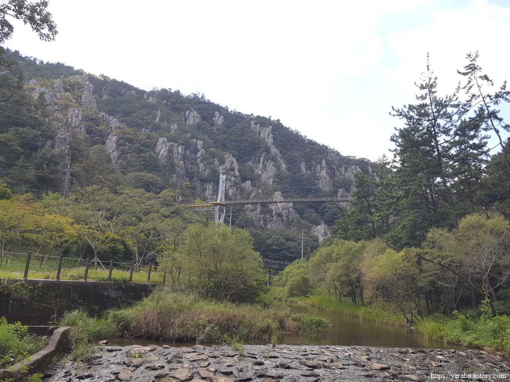 도암천을 건너 석문 공원에서 화장실도 다녀오고 잠시 휴식을 취하다가 공원 끝자락에서 다시 도암천을 건너서 구름다리로 향한다. 도암천 건너편에서 산 중턱으로 올라 구름다리를 통해서 석문산 중턱으로 향하는 길이다.