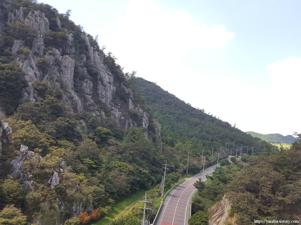 구름다리에서 바라본 석문공원의 풍경과 정면 석문산의 모습은 절경 그 자체이다.