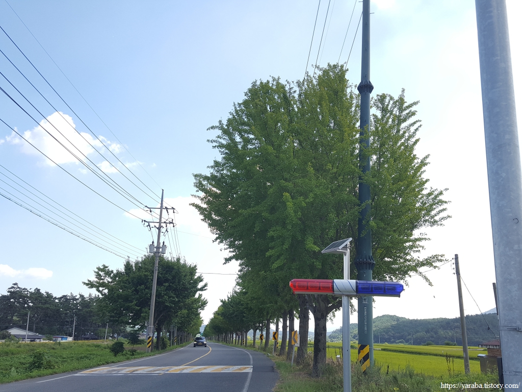 백도로 도로를 가로지르는 길, 길 양쪽으로 들어선 은행나무들이 일품이다. 도시의 은행나무라면 곳곳에 댕강댕강한 자국이 있었을 텐데 이곳의 은행나무들은 아무런 제약도, 상처도 없이 쭉쭉 뻗어 우람하다. 참 보기 좋다.