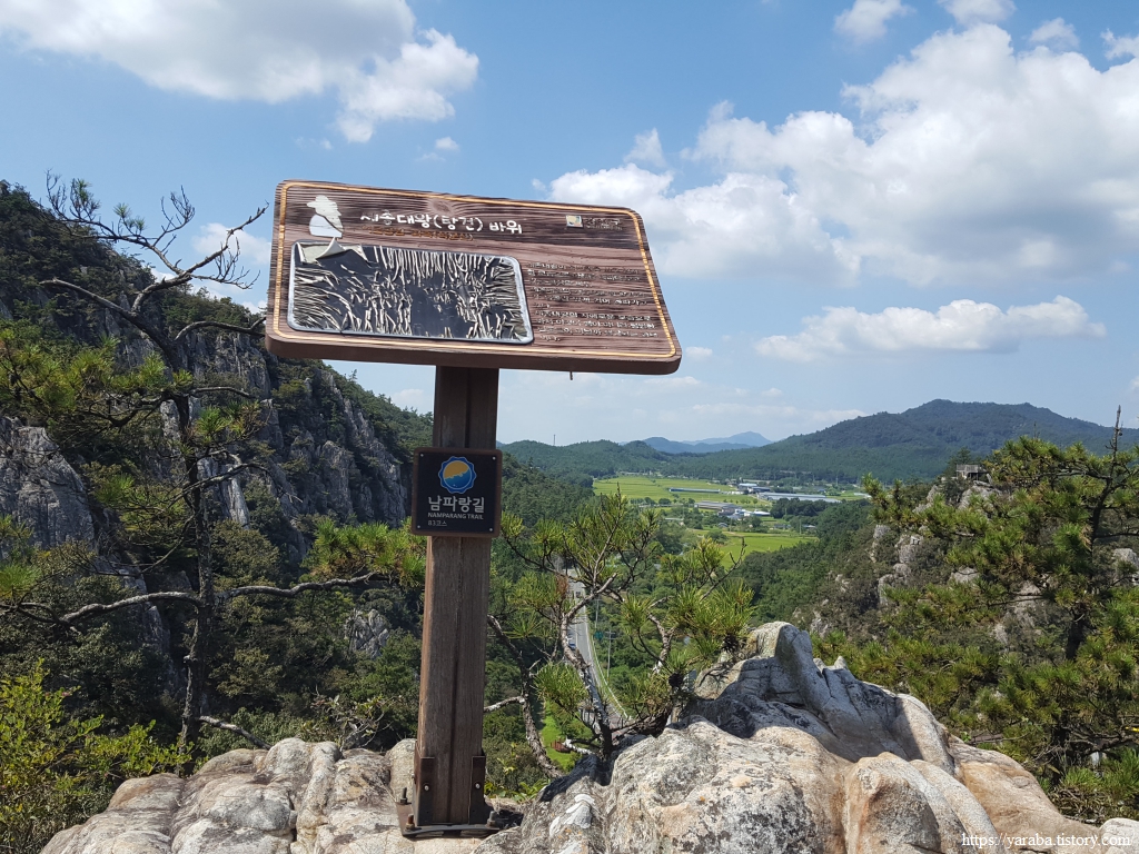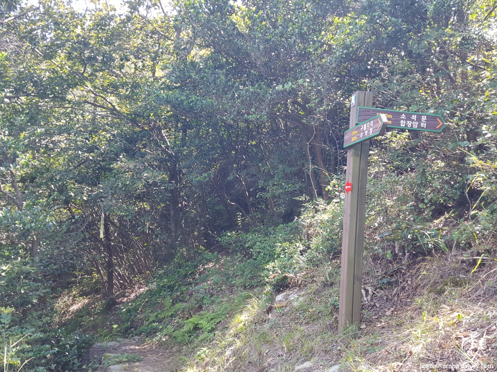 급한 오르막길을 오르면 세종대왕(탕건) 바위 안내문이 있었는데, 사진을 검색해 보면 옆에서 보았을 때 탕건을 쓴 임금이 오가는 길손을 내려다보는 모습과 진짜로 닮았다. 필자는 탕건 모양 바위만 찾다가 정작 탕건 바위는 찾지 못했다. ㅠㅠ 이곳을 지나면 길은 석문산 중턱의 산길을 따라 도암면 방향으로 돌아간다. 소석문 갈림길에서 남파랑길 표식을 따라 직진한다.