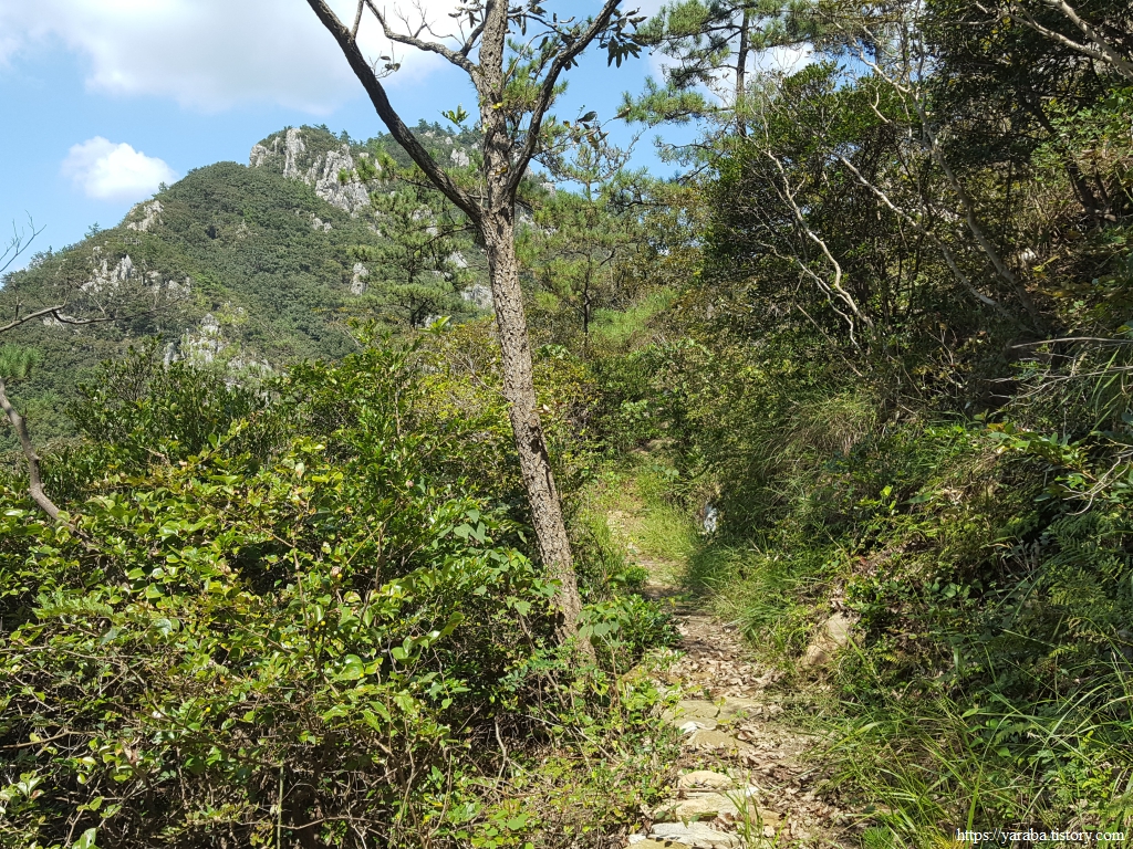 구름다리를 지나면 다리 아래로 바로 내려가는 길이 있기는 하지만 남파랑길은 소석문 방향 산길로 이동한다.