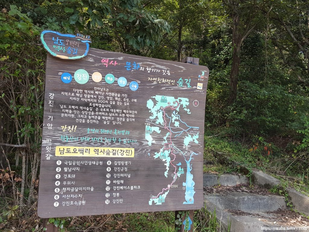 석문산을 내려오니 또 다른 이름의 길 안내판이 서있다. 남도 오백 리 역사 숲길이라는데 남파랑길과는 석문산 구간에서 겹치는 모양이다.
