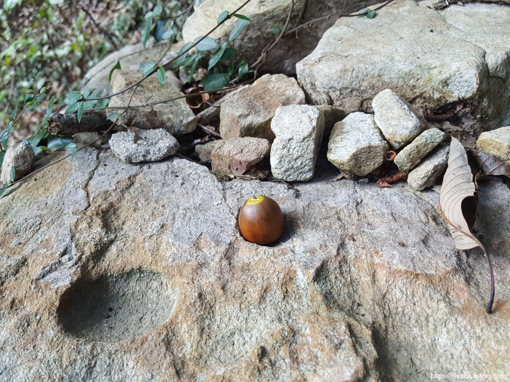 오르막을 오르다가 바닥에 떨어진 도토리를 바위 구멍에 올려보니 한 상 차려진 자연 식판 같다.