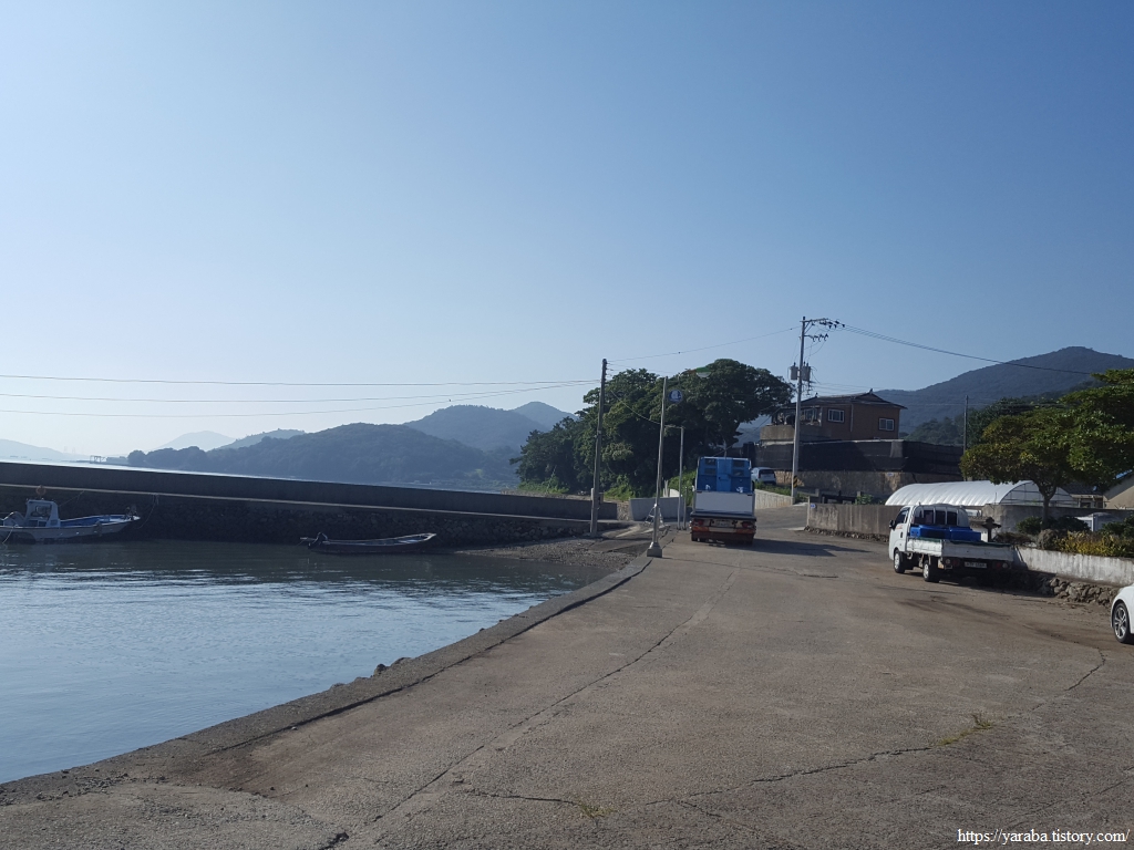 바다는 물을 가득 채운 만조에서 이제 다시 먼바다로 나가기 위해서 준비하고 있다. 갯일을 끝내면 뻘흙을 씻어 내는 물통에도 물을 가득 채워 놓았다. 물이 가득하니 이 인근에 넓게 펼쳐질 갯벌이 상상이 되지 않는다. 바다 건너편으로 보이는 섬은 고마도이다.