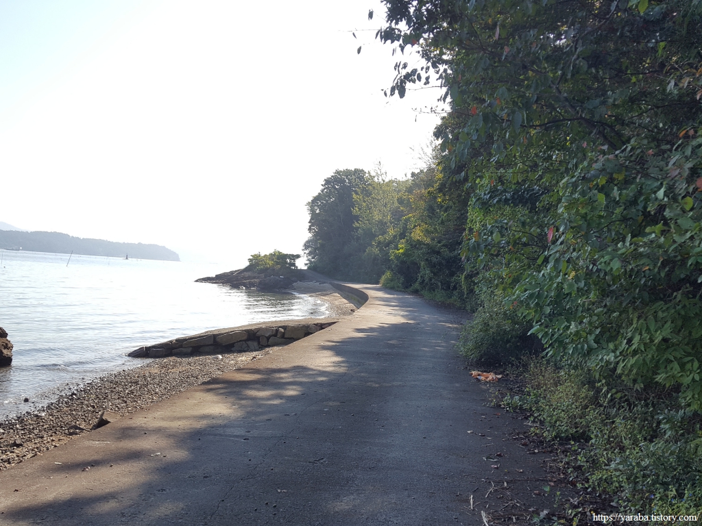 만조에 만나는 이 해안선 풍경은 물이 빠졌을 때와는 사뭇 다르지 않을까 싶다. 물이 들어와 있는 지금은 해안선을 뒤덮은 나무들의 기운에 푹 빠질 수 있는 그림이다. 이런 절경에서 매일 산책할 수 있는 영풍 마을 주민들은 얼마나 좋을까? 하는 부러움이 흘러넘친다.