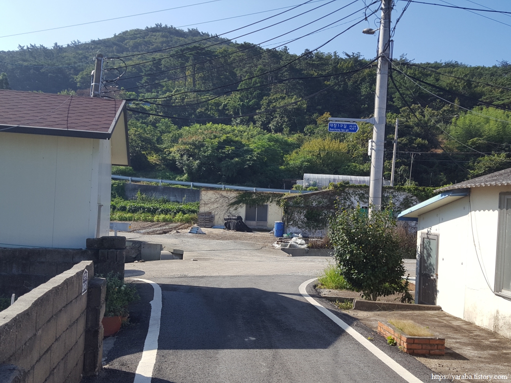 길은 불목리 해안에 자리한 여러 업체들을 우회하기 위해서 마을길을 돌아간다.