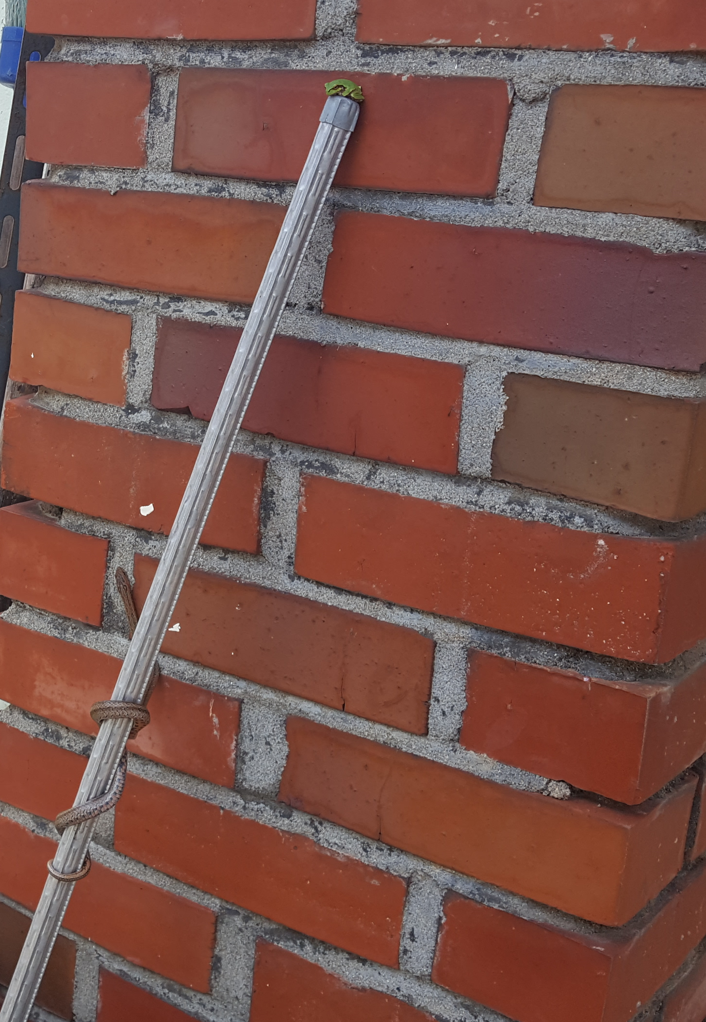 그런데, 잠시 텃밭을 다녀오다가 앞마당에서 벌어지고 있는 희한한 광경을 목격하게 되었다. 고추 지지대로 사용하던 것을 벽에 기대에 세워두었는데 청개구리는 그 꼭대기에 올라앉아 있고 뱀은 그것을 어떻게 알았는지 지지대를 감고 서서히 개구리를 향해 가고 있다. 뱀은 인기척이 있으면 보통 도망가는 것이 보통인데 개구리를 추적하고 있는 욕심을 차마 포기할 수 없는지 잠시 돌아갈까 하다가 다시 개구리를 향해서 아주 조심스레 접근한다.