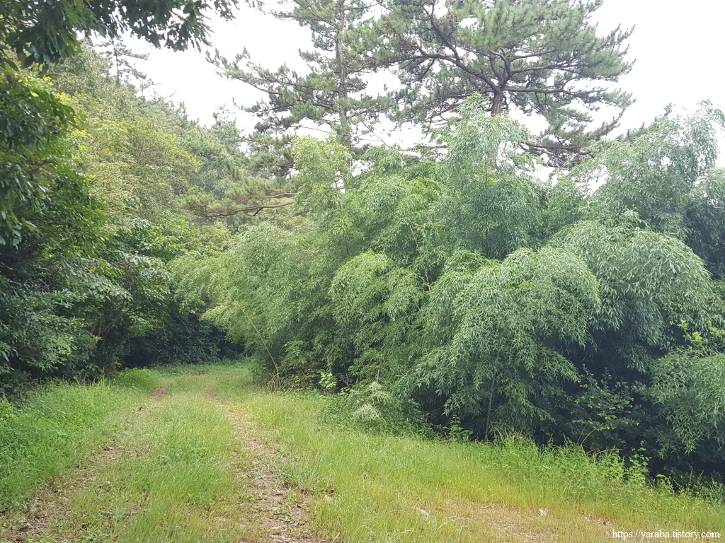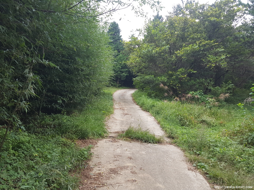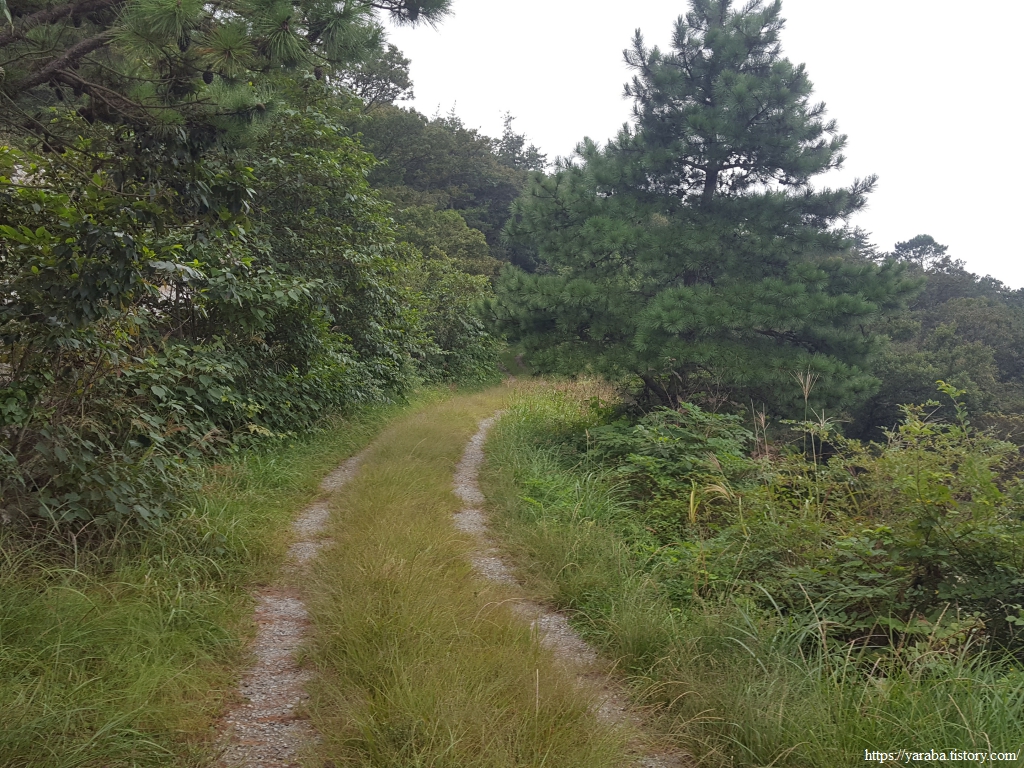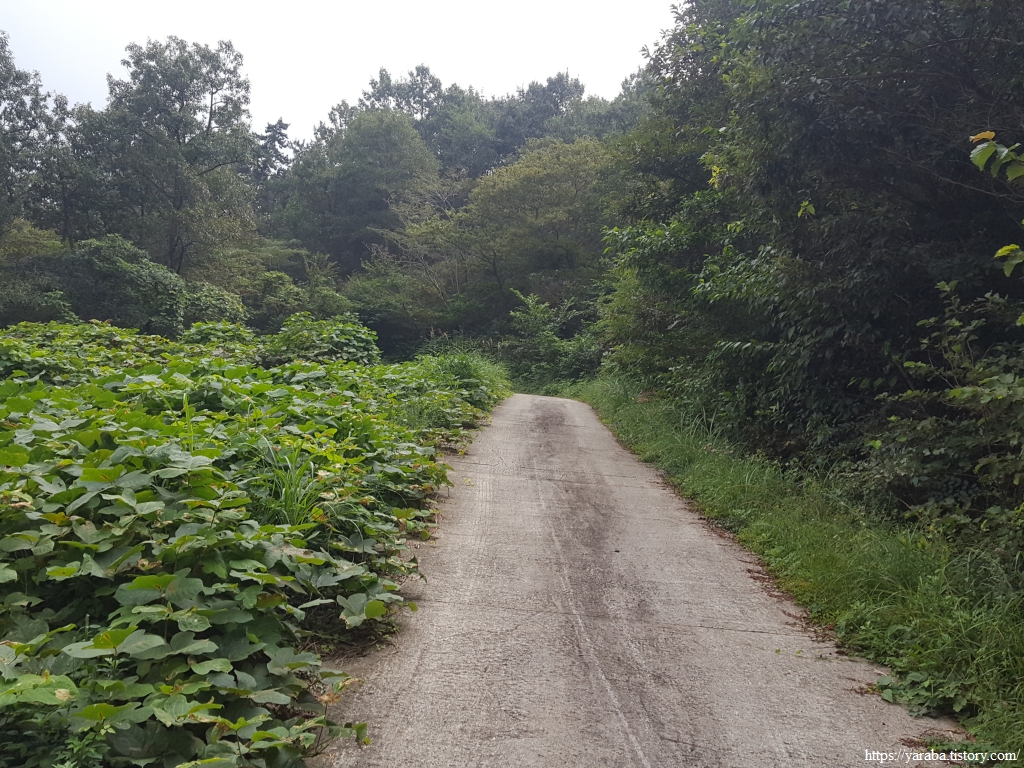 콘크리트 임도가 아닌 흙길 임도도 괜찮다. 다만, 이른 아침에 출발한 까닭에 풀잎에 맺힌 이슬들이 아직 마르지 않아 신발 앞부터 천천히 젖고 있다. 게다가 예보에 없던 비까지 토닥토닥 내리기 시작한다.ㅠㅠ