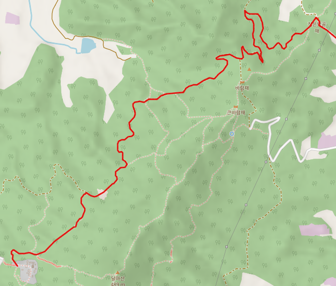 미황사로 향하는 임도는 송촌 마을에서 시작하여 달마산 정상으로 오르는 등산로를 가로지른다. 이곳에서 정상까지 2Km를 올라간다.