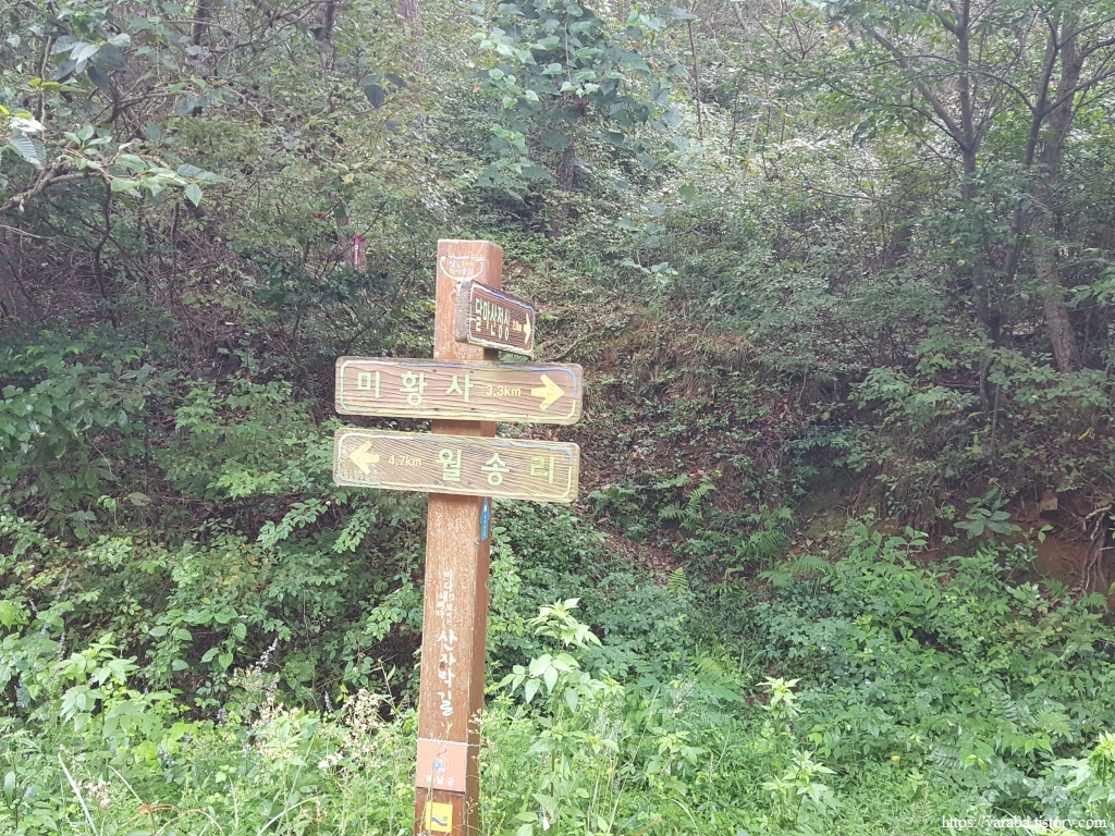 주변에 나무뿐인 임도를 걷다가 언뜻 비치는 해안 풍경은 짙은 구름과 함께 남창리와 이진리가 아련하게 보인다. 중간에 월송리 임도 구간에서 이진리로 이어지는 삼거리를 만나는데 미황사 방면으로 길을 계속 이어간다.