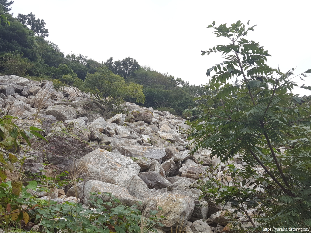 길은 또다시 넓은 너덜지대를 가로지르는데 금방이라도 쏟아져 내릴 것 같은 너덜 바위 사이로 뿌리를 내린 나무 한그루가 위대해 보인다.