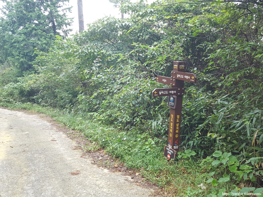 임도 삼거리에서 드디어 달마고도 표지석을 만난다. 달마고도는 달마산 주위 17.8km를 한 바퀴 도는 길로 7시간 정도 소요되며 남파랑길과는 일부 구간이 겹친다. 미황사 방면의 임도를 계속 걷는다.