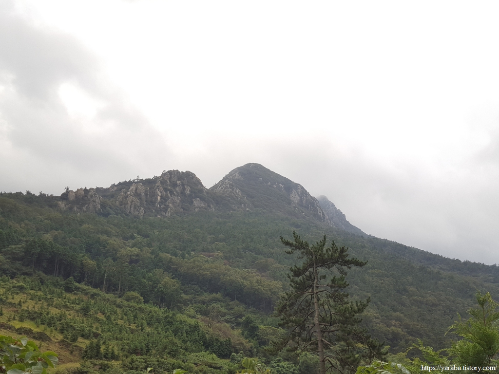 남파랑길이 걷지는 않지만 지금 보이는 관음봉부터 달마봉, 떡봉, 도솔봉으로 환상적인 능선이 이어진다. 남파랑길은 봉우리 아래 산중턱으로 이어지는 임도를 계속 걷는다.