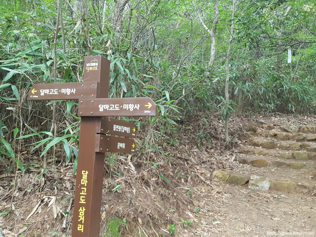 환상적인 숲길을 얼마나 걸었을까? 달마고도 삼거리에서 달마산 정상으로 향하는 등산로를 만난다.