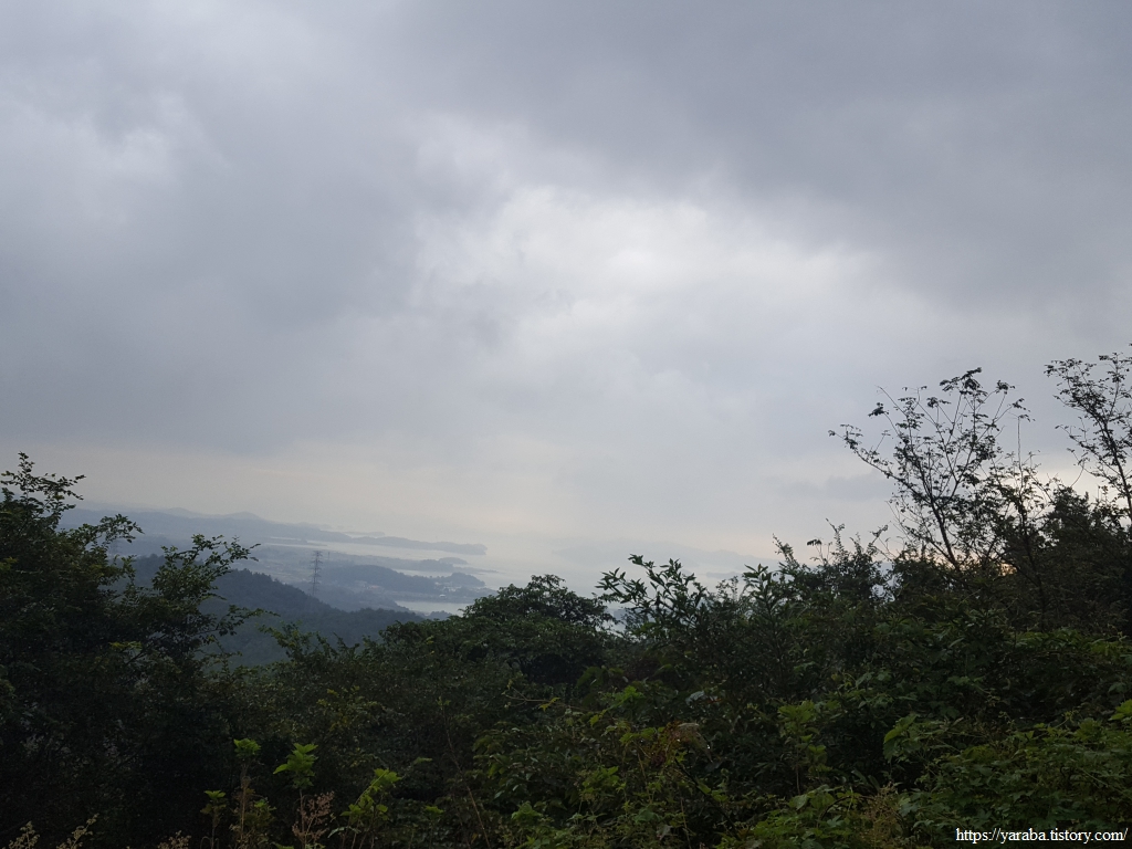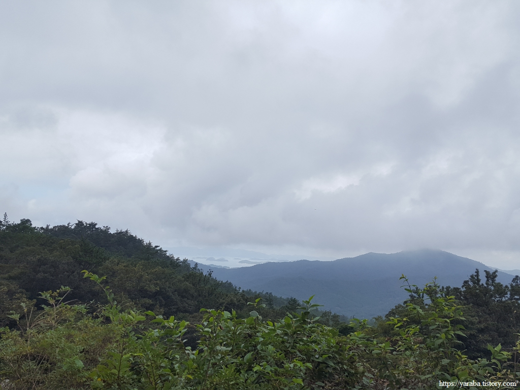 월송리 끝자락을 지나 서정리로 향하는 임도, 멀리 구름과 산 사이로 다도해의 섬들이 눈에 들어온다.