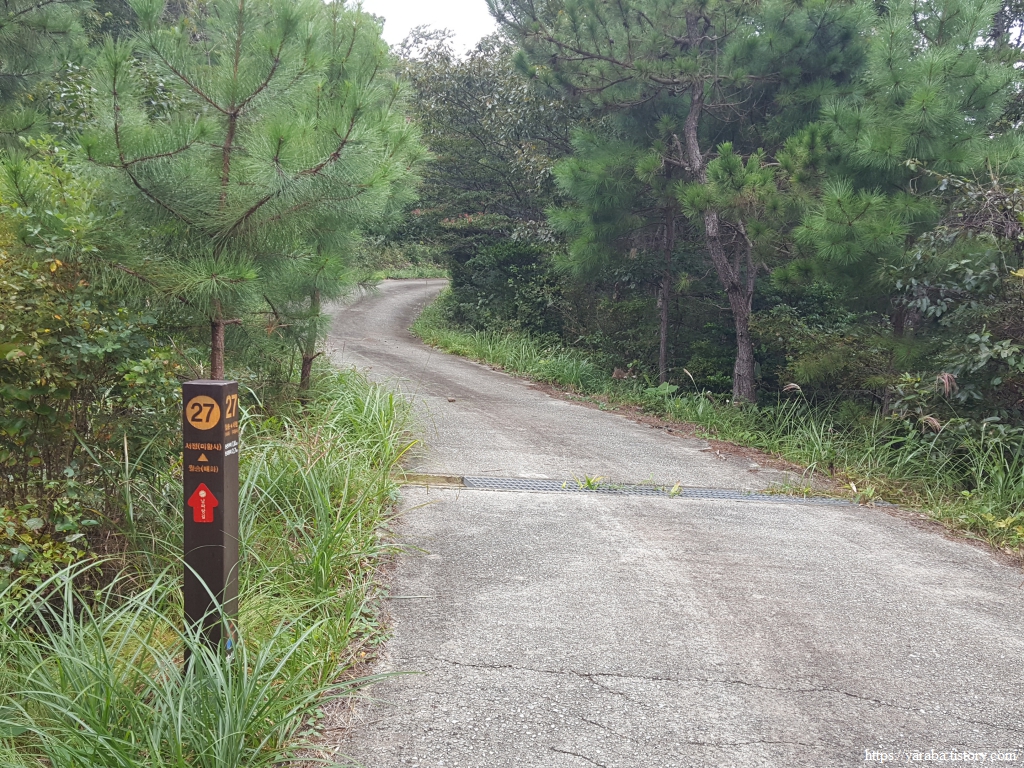 미황사로 가는 길은 구불구불, 오르락내리락 하지만 산 중턱으로 이어지는 임도를 어렵지 않게 걷는다. 1백 미터마다 길 옆에 박아 놓은 길 표식은 길을 지루하지 않게 돕는다. 길 표식을 보면 또 일백 미터를 걸었구나 하며......