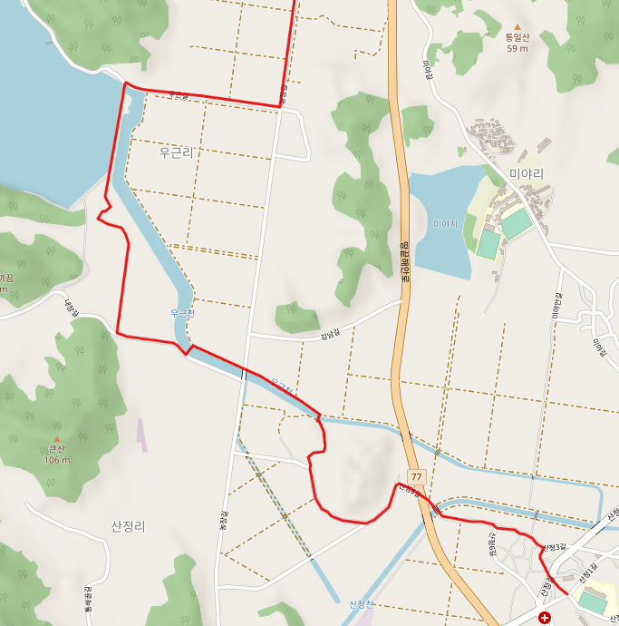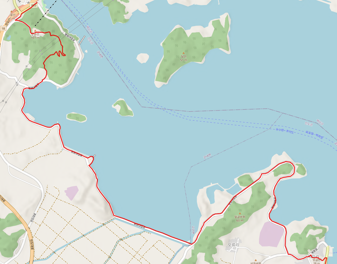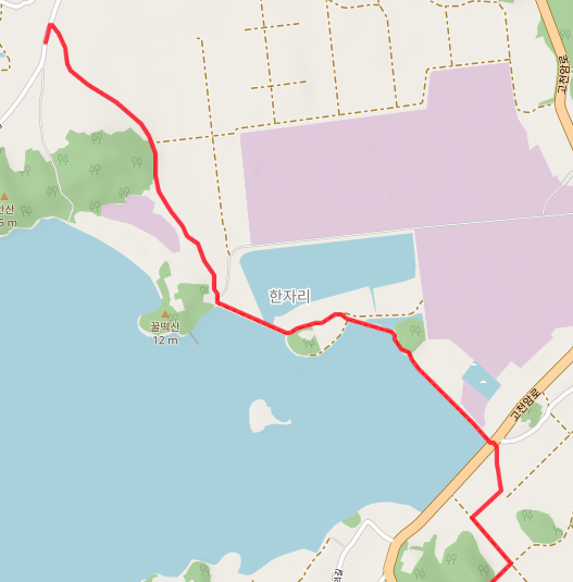 송지면사무소 앞에서 1코스에 이어서 2코스 걷기를 시작한다. 읍내를 빠져나가면 산정천을 건너 천변 둑방길을 따라 해변으로 나갔다가 수로 옆의 길을 따라 북쪽으로 이동한다.