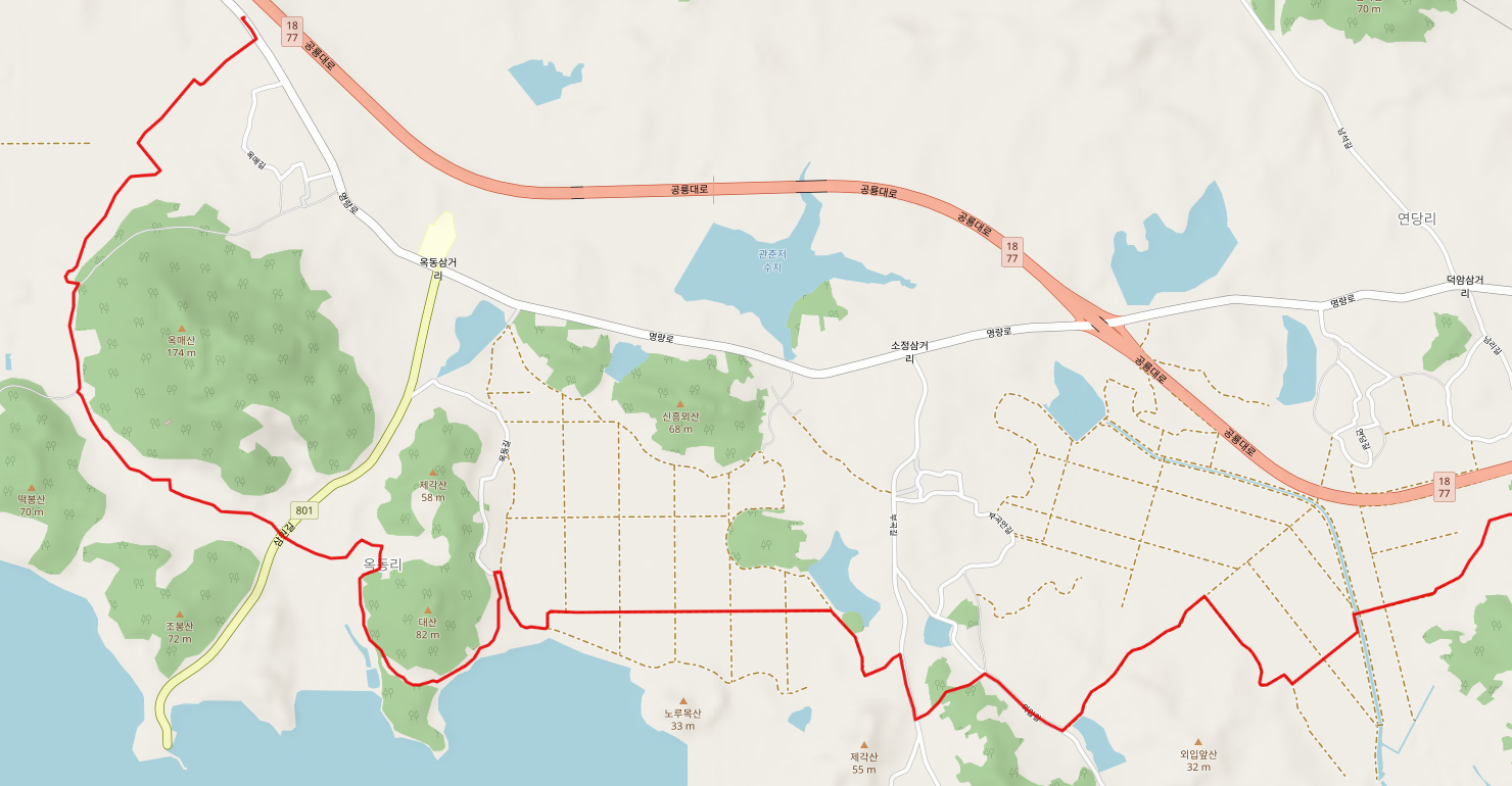 남리를 출발한 길은 외입제 저수지(6.7Km)와 옥동제 저수지(8.1Km)를 차례로 지나고 농로를 가로질러 대산 아랫자락을 돌아가면 옥동리마을회관(10.9Km)에 닿는다. 옥매산 아랫자락을 돌며 삼호리 마을회관을 지나 원문버스정류장에서 여정을 마무리한다.
