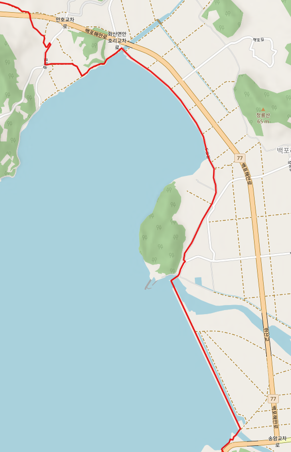 다음날 해남 읍내에서 송암 버스 정류장으로 돌아와서 길을 이어간다. 송지천과 현산천을 차례로 건너면 두모마을회관을(9.5Km) 지난다. 송지면에서 현산면 백포리를 짧게 지난다. 길은 두모마을 해안길을 걸으면 다시 화산면 안호리로 넘어가 중정 마을을 지난다.
